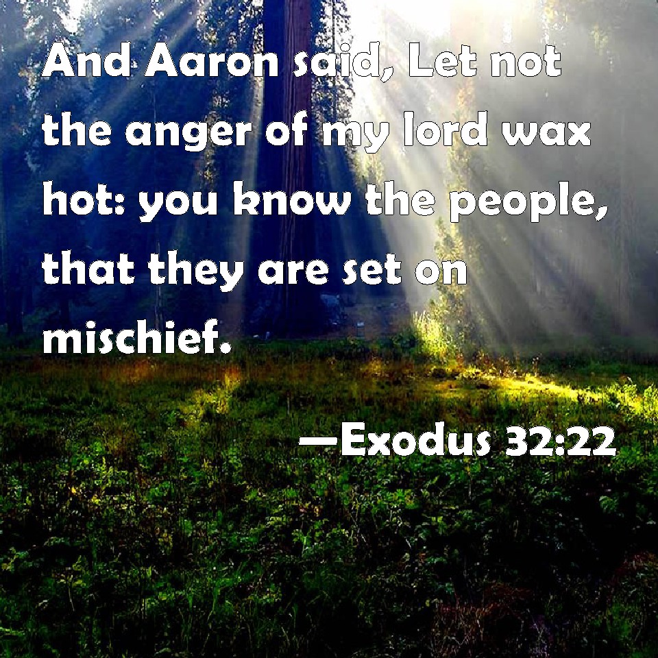 Choose a Background Exodus 32:22 And Aaron said, Let not the anger of my lord wax hot: you know the people, that they are set on mischief. KJV: And Aaron said, Let not the anger of my lord wax hot: thou knowest the people, that they are set on mischief. DRB: And he answered him: Let not my lord be offended: for thou knowest this people, that they are prone to evil. DBT: And Aaron said, Let not the anger of my lord burn! thou knowest the people, that they are set on mischief. ERV: And Aaron said, Let not the anger of my lord wax hot: thou knowest the people, that they are set on evil. WBT: And Aaron said, Let not the anger of my lord wax hot: thou knowest the people that they are set on mischief. WEB: Aaron said, "Don't let the anger of my lord grow hot. You know the people, that they are set on evil. YLT: and Aaron saith, 'Let not the anger of my lord burn; thou — thou hast known the people that it is in evil;Links Exodus 32:22 NIV • Exodus 32:22 NLT • Exodus 32:22 ESV • Exodus 32:22 NASB • Exodus 32:22 KJV • Exodus 32:22 Interlinear • Exodus 32:22 Commentaries • Exodus 32:22 Parallel Texts • Exodus 32:22 Bible Apps • Exodus 32:22 Parallel • Bible Hub |