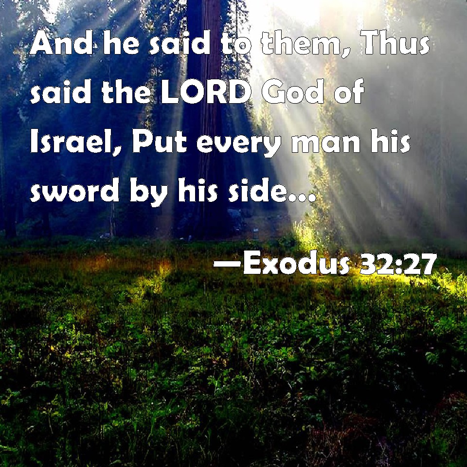 Choose a Background Exodus 32:27 And he said to them, Thus said the LORD God of Israel, Put every man his sword by his side, and go in and out from gate to gate throughout the camp, and slay every man his brother, and every man his companion, and every man his neighbor. KJV: And he said unto them, Thus saith the LORD God of Israel, Put every man his sword by his side, and go in and out from gate to gate throughout the camp, and slay every man his brother, and every man his companion, and every man his neighbour. DRB: And he said to them: Thus saith the Lord God of Israel: Put every man his sword upon his thigh: go, and return from gate to gate through the midst of the camp, and let every man kill his brother, and friend, and neighbour. DBT: And he said to them, Thus saith Jehovah, the God of Israel: Put every man his sword upon his hip; go and return from gate to gate through the camp, and slay every man his brother, and every man his friend, and every man his neighbour. ERV: And he said unto them, Thus saith the LORD, the God of Israel, Put ye every man his sword upon his thigh, and go to and fro from gate to gate throughout the camp, and slay every man his brother, and every man his companion, and every man his neighbour. WBT: And he said to them, Thus saith the LORD God of Israel, Put every man his sword by his side, and go in and out from gate to gate throughout the camp, and slay every man his brother, and every man his companion, and every man his neighbor. WEB: He said to them, "Thus says Yahweh, the God of Israel, 'Every man put his sword on his thigh, and go back and forth from gate to gate throughout the camp, and every man kill his brother, and every man his companion, and every man his neighbor.'" YLT: and he saith to them, 'Thus said Jehovah, God of Israel, Put each his sword by his thigh, pass over and turn back from gate to gate through the camp, and slay each his brother, and each his friend, and each his relation.'Links Exodus 32:27 NIV • Exodus 32:27 NLT • Exodus 32:27 ESV • Exodus 32:27 NASB • Exodus 32:27 KJV • Exodus 32:27 Interlinear • Exodus 32:27 Commentaries • Exodus 32:27 Parallel Texts • Exodus 32:27 Bible Apps • Exodus 32:27 Parallel • Bible Hub |