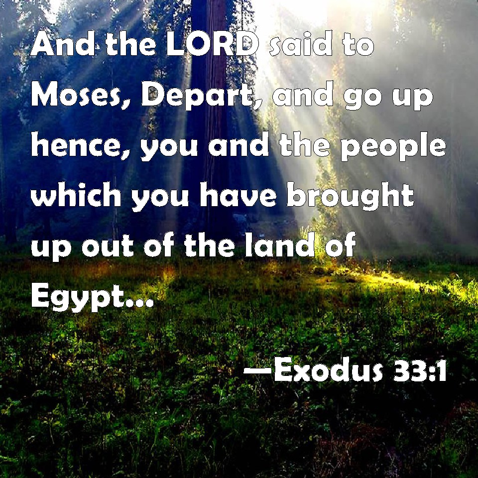 Exodus 33:1 And the LORD said to Moses, Depart, and go up hence, you and the people which you have brought up out of the land of Egypt, to the land which I swore to Abraham, to Isaac, and to Jacob, saying, To your seed will I give it: