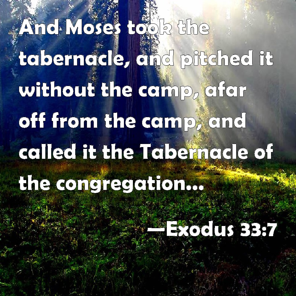 Choose a Background Exodus 33:7 And Moses took the tabernacle, and pitched it without the camp, afar off from the camp, and called it the Tabernacle of the congregation. And it came to pass, that every one which sought the LORD went out to the tabernacle of the congregation, which was without the camp. KJV: And Moses took the tabernacle, and pitched it without the camp, afar off from the camp, and called it the Tabernacle of the congregation. And it came to pass, that every one which sought the LORD went out unto the tabernacle of the congregation, which was without the camp. DRB: Moses also taking the tabernacle, pitched it without the camp afar off, and called the name thereof, The tabernacle of the covenant. And all the people that had any question, went forth to the tabernacle of the covenant, without the camp. DBT: And Moses took the tent, and pitched it outside the camp, far from the camp, and called it the Tent of meeting. And it came to pass that every one who sought Jehovah went out to the tent of meeting which was outside the camp. ERV: Now Moses used to take the tent and to pitch it without the camp, afar off from the camp; and he called it, The tent of meeting. And it came to pass, that every one which sought the LORD went out unto the tent of meeting, which was without the camp. WBT: And Moses took the tabernacle, and pitched it without the camp far from the camp, and called it the Tabernacle of the congregation. And it came to pass, that every one who sought the LORD, went out to the tabernacle of the congregation, which was without the camp. WEB: Now Moses used to take the tent and to pitch it outside the camp, far away from the camp, and he called it "The Tent of Meeting." It happened that everyone who sought Yahweh went out to the Tent of Meeting, which was outside the camp. YLT: And Moses taketh the tent, and hath stretched it out at the outside of the camp, afar off from the camp, and hath called it, 'Tent of Meeting;' and it hath come to pass, every one seeking Jehovah goeth out unto the tent of meeting, which is at the outside of the camp.Links Exodus 33:7 NIV • Exodus 33:7 NLT • Exodus 33:7 ESV • Exodus 33:7 NASB • Exodus 33:7 KJV • Exodus 33:7 Interlinear • Exodus 33:7 Commentaries • Exodus 33:7 Parallel Texts • Exodus 33:7 Bible Apps • Exodus 33:7 Parallel • Bible Hub |