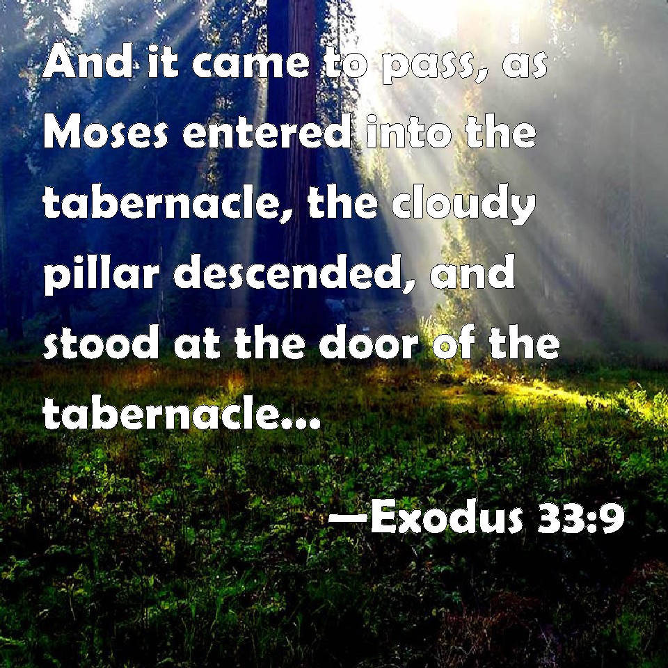 Choose a Background Exodus 33:9 And it came to pass, as Moses entered into the tabernacle, the cloudy pillar descended, and stood at the door of the tabernacle, and the Lord talked with Moses. KJV: And it came to pass, as Moses entered into the tabernacle, the cloudy pillar descended, and stood at the door of the tabernacle, and the LORD talked with Moses. DRB: And when he was gone into the tabernacle of the covenant, the pillar of the cloud came down, and stood at the door, and he spoke with Moses. DBT: And it came to pass when Moses entered into the tent, the pillar of cloud descended, and stood at the entrance of the tent, and Jehovah talked with Moses. ERV: And it came to pass, when Moses entered into the Tent, the pillar of cloud descended, and stood at the door of the Tent: and the LORD spake with Moses. WBT: And it came to pass, as Moses entered into the tabernacle, the cloudy pillar descended, and stood at the door of the tabernacle, and the LORD talked with Moses. WEB: It happened, when Moses entered into the Tent, that the pillar of cloud descended, stood at the door of the Tent, and spoke with Moses. YLT: And it hath come to pass, at the going in of Moses to the tent, the pillar of the cloud cometh down, and hath stood at the opening of the tent, and He hath spoken with Moses;Links Exodus 33:9 NIV • Exodus 33:9 NLT • Exodus 33:9 ESV • Exodus 33:9 NASB • Exodus 33:9 KJV • Exodus 33:9 Interlinear • Exodus 33:9 Commentaries • Exodus 33:9 Parallel Texts • Exodus 33:9 Bible Apps • Exodus 33:9 Parallel • Bible Hub |