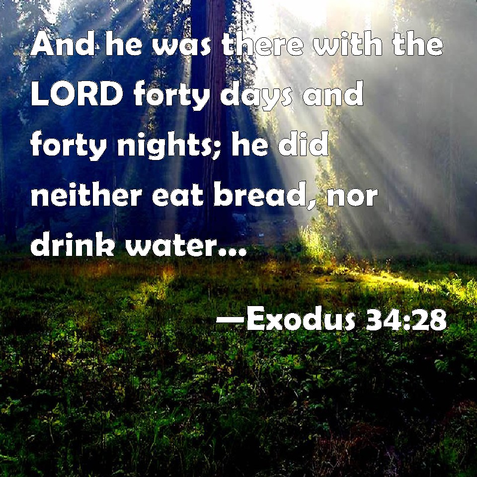 Choose a Background Exodus 34:28 And he was there with the LORD forty days and forty nights; he did neither eat bread, nor drink water. And he wrote on the tables the words of the covenant, the ten commandments. KJV: And he was there with the LORD forty days and forty nights; he did neither eat bread, nor drink water. And he wrote upon the tables the words of the covenant, the ten commandments. DRB: And he was there with the Lord forty days and forty nights: he neither ate bread nor drank water, and he wrote upon the tables the ten words of the covenant. DBT: And he was there with Jehovah forty days and forty nights; he ate no bread, and drank no water. And he wrote on the tables the words of the covenant, the ten words. ERV: And he was there with the LORD forty days and forty nights; he did neither eat bread, nor drink water. And he wrote upon the tables the words of the covenant, the ten commandments. WBT: And he was there with the LORD forty days and forty nights; he neither ate bread nor drank water: and he wrote upon the tables the words of the covenant, the ten commandments. WEB: He was there with Yahweh forty days and forty nights; he neither ate bread, nor drank water. He wrote on the tablets the words of the covenant, the ten commandments. YLT: And he is there with Jehovah forty days and forty nights; bread he hath not eaten, and water he hath not drunk; and he writeth on the tables the matters of the covenant — the ten matters.Links Exodus 34:28 NIV • Exodus 34:28 NLT • Exodus 34:28 ESV • Exodus 34:28 NASB • Exodus 34:28 KJV • Exodus 34:28 Interlinear • Exodus 34:28 Commentaries • Exodus 34:28 Parallel Texts • Exodus 34:28 Bible Apps • Exodus 34:28 Parallel • Bible Hub |