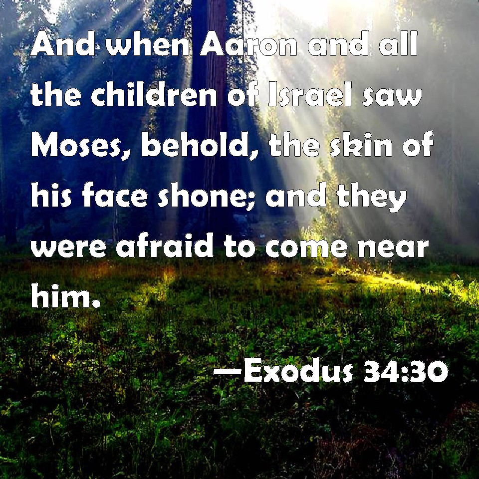 Choose a Background Exodus 34:30 And when Aaron and all the children of Israel saw Moses, behold, the skin of his face shone; and they were afraid to come near him. KJV: And when Aaron and all the children of Israel saw Moses, behold, the skin of his face shone; and they were afraid to come nigh him. DRB: And Aaron and the children of Israel seeing the face of Moses horned, were afraid to come near. DBT: And Aaron and all the children of Israel saw Moses, and behold, the skin of his face shone; and they were afraid to come near him. ERV: And when Aaron and all the children of Israel saw Moses, behold, the skin of his face shone; and they were afraid to come nigh him. WBT: And when Aaron and all the children of Israel saw Moses, behold, the skin of his face shone, and they were afraid to come nigh him. WEB: When Aaron and all the children of Israel saw Moses, behold, the skin of his face shone; and they were afraid to come near him. YLT: and Aaron seeth — all the sons of Israel also — Moses, and lo, the skin of his face hath shone, and they are afraid of coming nigh unto him.Links Exodus 34:30 NIV • Exodus 34:30 NLT • Exodus 34:30 ESV • Exodus 34:30 NASB • Exodus 34:30 KJV • Exodus 34:30 Interlinear • Exodus 34:30 Commentaries • Exodus 34:30 Parallel Texts • Exodus 34:30 Bible Apps • Exodus 34:30 Parallel • Bible Hub |