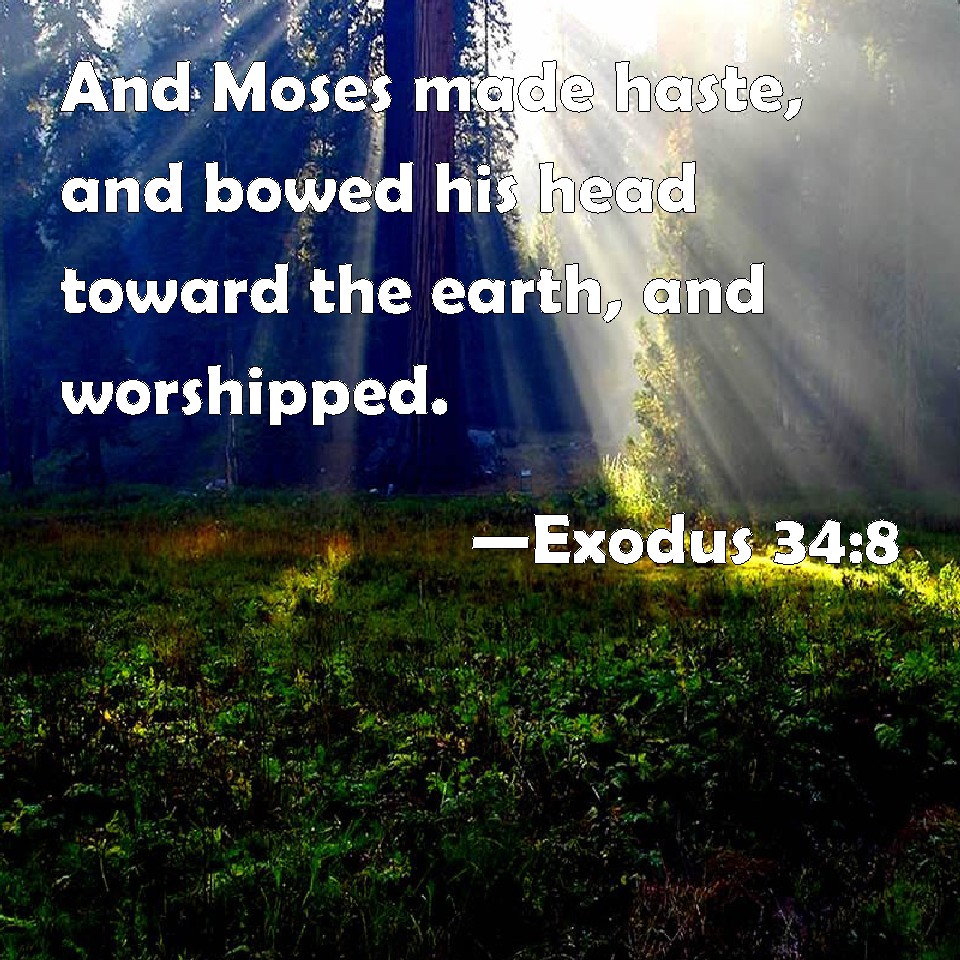 Choose a Background Exodus 34:8 And Moses made haste, and bowed his head toward the earth, and worshipped. KJV: And Moses made haste, and bowed his head toward the earth, and worshipped. DRB: And Moses making haste, bowed down prostrate unto the earth, and adoring, DBT: And Moses made haste, and bowed his head to the earth and worshipped, ERV: And Moses made haste, and bowed his head toward the earth, and worshipped. WBT: And Moses made haste, and bowed his head towards the earth, and worshiped. WEB: Moses hurried and bowed his head toward the earth, and worshiped. YLT: And Moses hasteth, and boweth to the earth, and doth obeisance,Links Exodus 34:8 NIV • Exodus 34:8 NLT • Exodus 34:8 ESV • Exodus 34:8 NASB • Exodus 34:8 KJV • Exodus 34:8 Interlinear • Exodus 34:8 Commentaries • Exodus 34:8 Parallel Texts • Exodus 34:8 Bible Apps • Exodus 34:8 Parallel • Bible Hub |