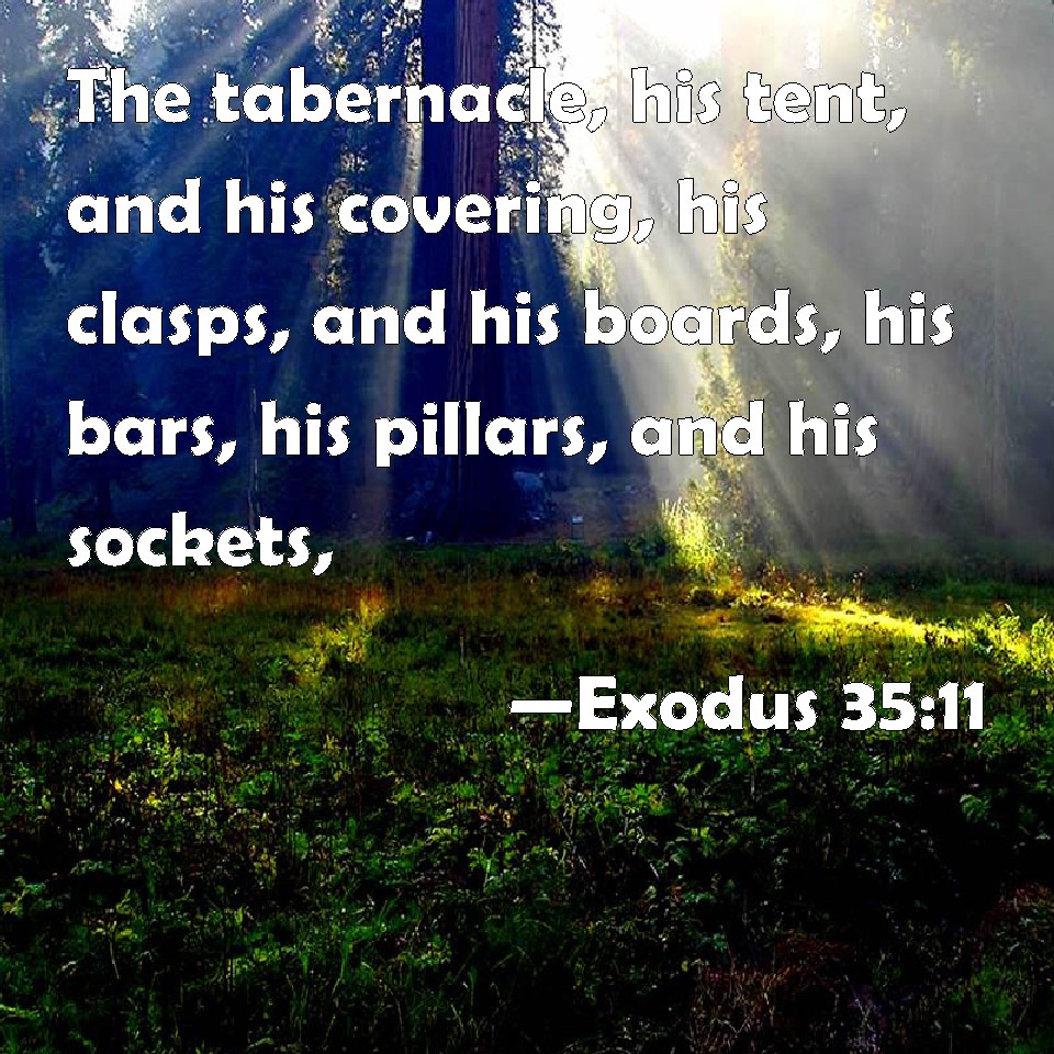 Choose a Background Exodus 35:11 The tabernacle, his tent, and his covering, his clasps, and his boards, his bars, his pillars, and his sockets, KJV: The tabernacle, his tent, and his covering, his taches, and his boards, his bars, his pillars, and his sockets, DRB: To wit, the tabernacle and the roof thereof, and the cover, the rings, and the board work with the oars, the pillars, and the sockets: DBT: the tabernacle, its tent, and its covering, its clasps, and its boards, its bars, its pillars, and its bases; ERV: the tabernacle, its tent, and its covering, its clasps, and its boards, its bars, its pillars, and its sockets; WBT: The tabernacle, its tent, and its covering, its buttons, and its boards, its bars, its pillars, and its sockets, WEB: the tabernacle, its outer covering, its roof, its clasps, its boards, its bars, its pillars, and its sockets; YLT: 'The tabernacle, its tent, and its covering, its hooks, and its boards, its bars, its pillars, and its sockets,Links Exodus 35:11 NIV • Exodus 35:11 NLT • Exodus 35:11 ESV • Exodus 35:11 NASB • Exodus 35:11 KJV • Exodus 35:11 Interlinear • Exodus 35:11 Commentaries • Exodus 35:11 Parallel Texts • Exodus 35:11 Bible Apps • Exodus 35:11 Parallel • Bible Hub |