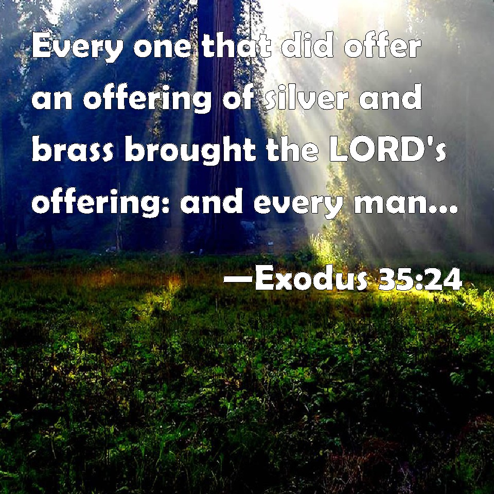 Choose a Background Exodus 35:24 Every one that did offer an offering of silver and brass brought the LORD's offering: and every man, with whom was found shittim wood for any work of the service, brought it. KJV: Every one that did offer an offering of silver and brass brought the LORD'S offering: and every man, with whom was found shittim wood for any work of the service, brought it. DRB: Metal of silver and brass, they offered it to the Lord, and setim wood for divers uses. DBT: All they that offered a heave-offering of silver and copper brought Jehovah's heave-offering. And every one with whom was found acacia-wood for all manner of work of the service, brought it. ERV: Every one that did offer an offering of silver and brass brought the LORD'S offering: and every man, with whom was found acacia wood for any work of the service, brought it. WBT: Every one that offered an offering of silver and brass brought the LORD'S offering: and every man with whom was found shittim wood for any work of the service, brought it. WEB: Everyone who did offer an offering of silver and brass brought Yahweh's offering; and everyone, with whom was found acacia wood for any work of the service, brought it. YLT: every one lifting up a heave-offering of silver and brass have brought in the heave-offering of Jehovah; and every one with whom hath been found shittim wood for any work of the service brought it in.Links Exodus 35:24 NIV • Exodus 35:24 NLT • Exodus 35:24 ESV • Exodus 35:24 NASB • Exodus 35:24 KJV • Exodus 35:24 Interlinear • Exodus 35:24 Commentaries • Exodus 35:24 Parallel Texts • Exodus 35:24 Bible Apps • Exodus 35:24 Parallel • Bible Hub |