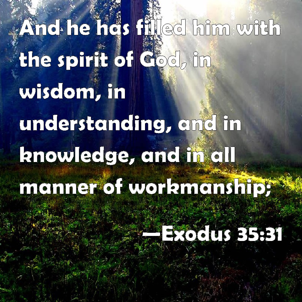 Choose a Background Exodus 35:31 And he has filled him with the spirit of God, in wisdom, in understanding, and in knowledge, and in all manner of workmanship; KJV: And he hath filled him with the spirit of God, in wisdom, in understanding, and in knowledge, and in all manner of workmanship; DRB: And hath filled him with the spirit of God, with wisdom and understanding and knowledge and all learning. DBT: and he has filled him with the spirit of God, in wisdom, in understanding, and in knowledge, and in all manner of workmanship, ERV: and he hath filled him with the spirit of God, in wisdom, in understanding, and in knowledge, and in all manner of workmanship; WBT: And he hath filled him with the spirit of God, in wisdom, in understanding, and in knowledge, and in all manner of workmanship; WEB: He has filled him with the Spirit of God, in wisdom, in understanding, in knowledge, and in all kinds of workmanship; YLT: and He doth fill him with the Spirit of God, in wisdom, in understanding, and in knowledge, and in all work,Links Exodus 35:31 NIV • Exodus 35:31 NLT • Exodus 35:31 ESV • Exodus 35:31 NASB • Exodus 35:31 KJV • Exodus 35:31 Interlinear • Exodus 35:31 Commentaries • Exodus 35:31 Parallel Texts • Exodus 35:31 Bible Apps • Exodus 35:31 Parallel • Bible Hub |