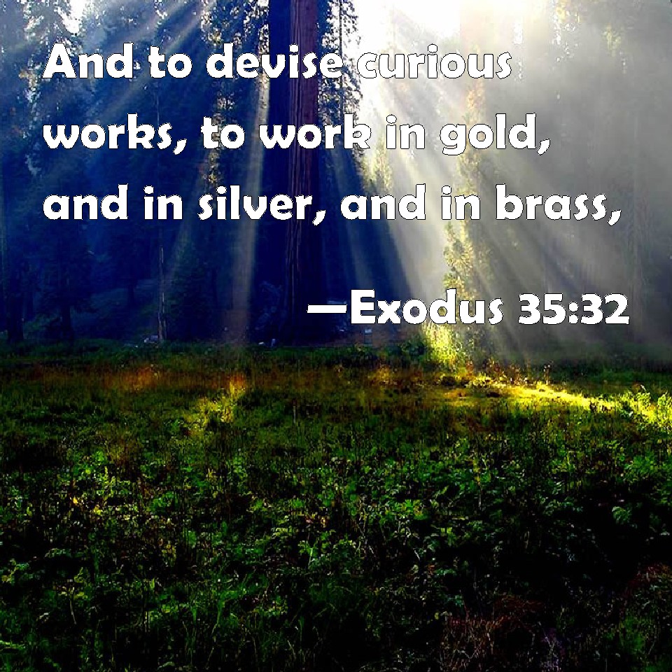 Choose a Background Exodus 35:32 And to devise curious works, to work in gold, and in silver, and in brass, KJV: And to devise curious works, to work in gold, and in silver, and in brass, DRB: To devise and to work in gold and silver and brass, DBT: and to devise artistic things: to work in gold, and in silver, and in copper, ERV: and to devise cunning works, to work in gold, and in silver, and in brass, WBT: And to devise curious works, to work in gold, and in silver, and in brass, WEB: and to make skillful works, to work in gold, in silver, in brass, YLT: even to devise devices to work in gold, and in silver, and in brass,Links Exodus 35:32 NIV • Exodus 35:32 NLT • Exodus 35:32 ESV • Exodus 35:32 NASB • Exodus 35:32 KJV • Exodus 35:32 Interlinear • Exodus 35:32 Commentaries • Exodus 35:32 Parallel Texts • Exodus 35:32 Bible Apps • Exodus 35:32 Parallel • Bible Hub |