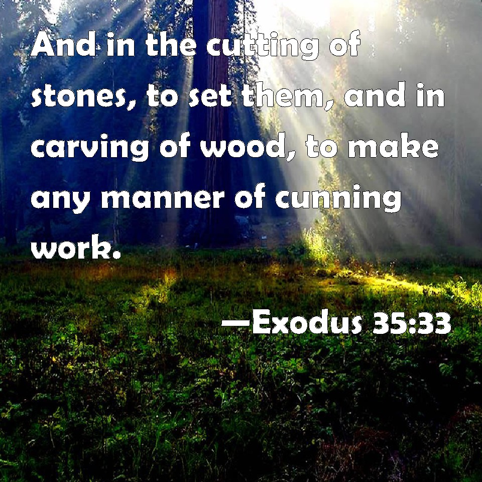Choose a Background Exodus 35:33 And in the cutting of stones, to set them, and in carving of wood, to make any manner of cunning work. KJV: And in the cutting of stones, to set them, and in carving of wood, to make any manner of cunning work. DRB: And in engraving stones, and in carpenters' work. Whatsoever can be devised artificially, DBT: and in cutting of stones, for setting, and in carving of wood, to execute all artistic work; ERV: and in cutting of stones for setting, and in carving of wood, to work in all manner of cunning workmanship. WBT: And in the cutting of stones, to set them, and in carving of wood, to make any manner of curious work. WEB: in cutting of stones for setting, and in carving of wood, to work in all kinds of skillful workmanship. YLT: and in graving of stones for settings, and in graving of wood to work in any work of design.Links Exodus 35:33 NIV • Exodus 35:33 NLT • Exodus 35:33 ESV • Exodus 35:33 NASB • Exodus 35:33 KJV • Exodus 35:33 Interlinear • Exodus 35:33 Commentaries • Exodus 35:33 Parallel Texts • Exodus 35:33 Bible Apps • Exodus 35:33 Parallel • Bible Hub |