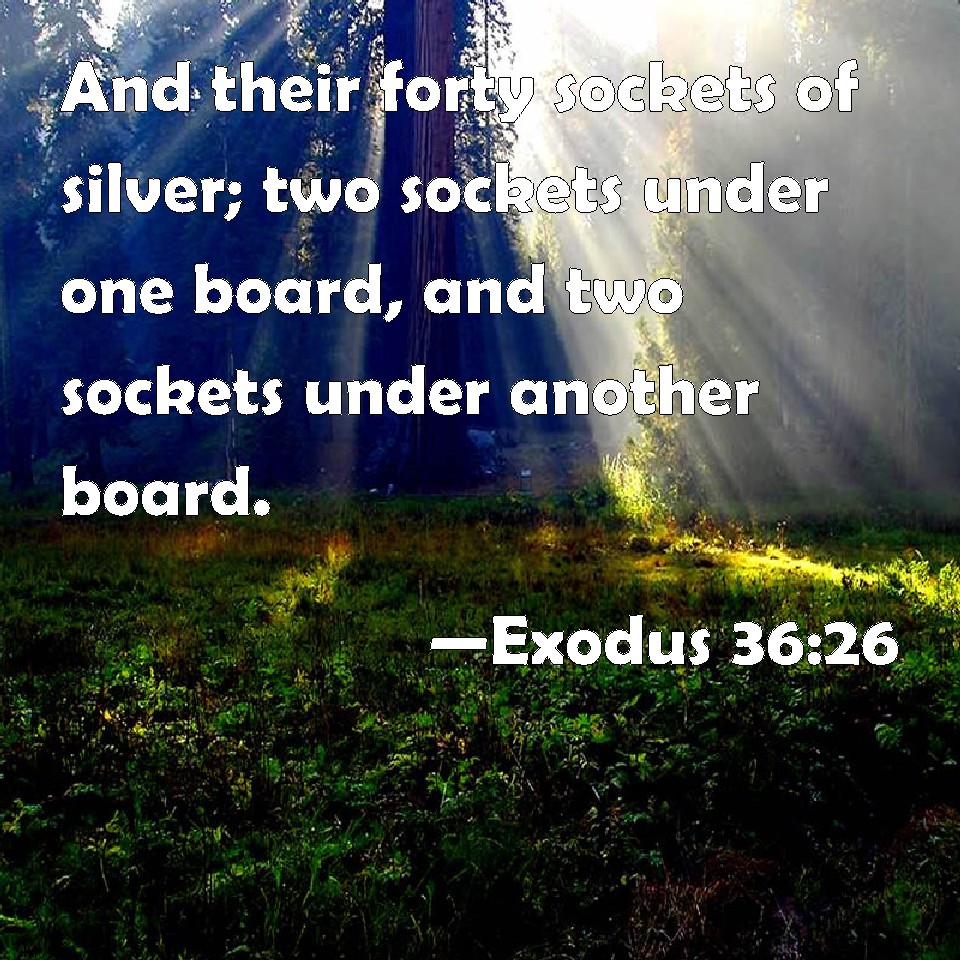 Choose a Background Exodus 36:26 And their forty sockets of silver; two sockets under one board, and two sockets under another board. KJV: And their forty sockets of silver; two sockets under one board, and two sockets under another board. DRB: With forty sockets of silver, two sockets for every board. DBT: and their forty bases of silver, two bases under one board, and two bases under another board. ERV: and their forty sockets of silver; two sockets under one board, and two sockets under another board. WBT: And their forty sockets of silver; two sockets under one board, and two sockets under another board. WEB: and their forty sockets of silver; two sockets under one board, and two sockets under another board. YLT: and their forty sockets of silver, two sockets under the one board, and two sockets under the other board;Links Exodus 36:26 NIV • Exodus 36:26 NLT • Exodus 36:26 ESV • Exodus 36:26 NASB • Exodus 36:26 KJV • Exodus 36:26 Interlinear • Exodus 36:26 Commentaries • Exodus 36:26 Parallel Texts • Exodus 36:26 Bible Apps • Exodus 36:26 Parallel • Bible Hub |
