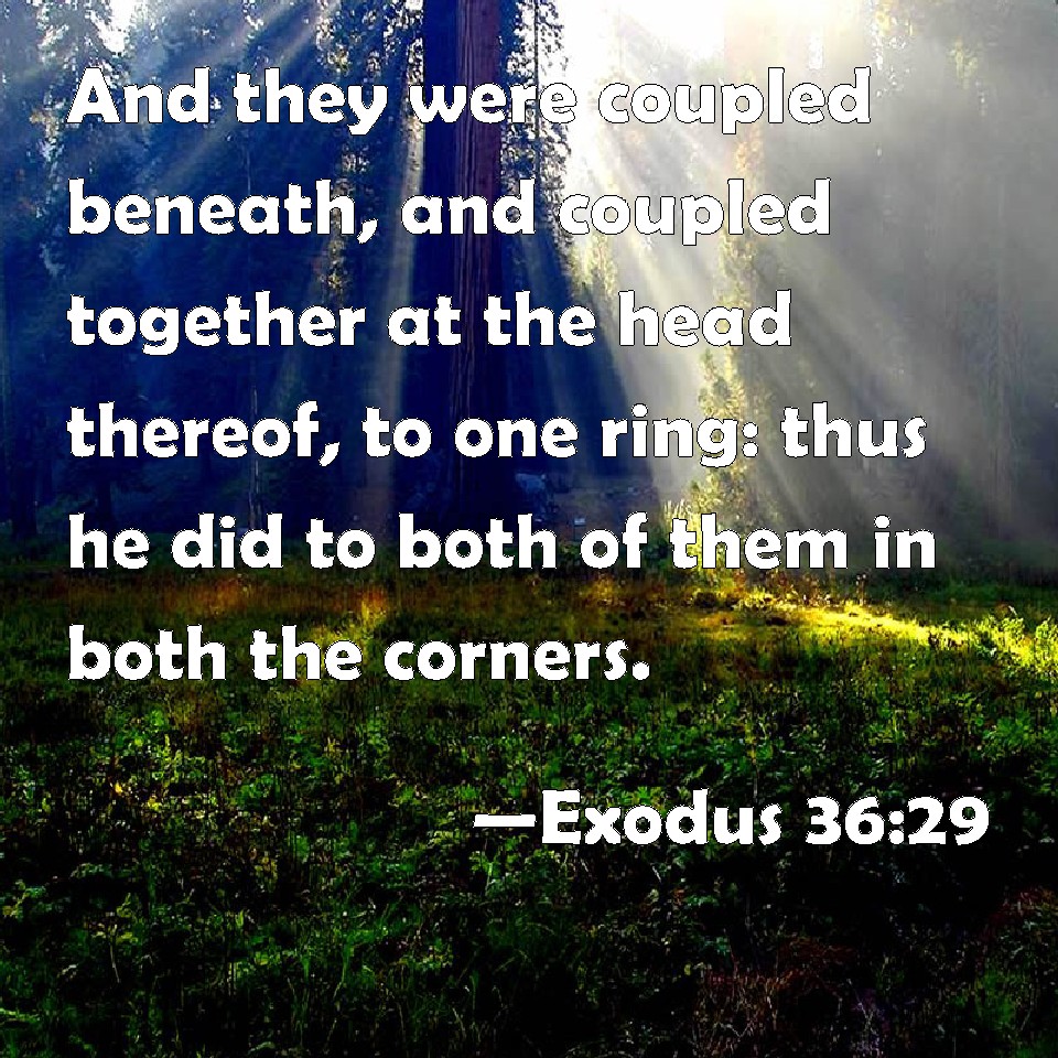Choose a Background Exodus 36:29 And they were coupled beneath, and coupled together at the head thereof, to one ring: thus he did to both of them in both the corners. KJV: And they were coupled beneath, and coupled together at the head thereof, to one ring: thus he did to both of them in both the corners. DRB: Which were also joined from beneath unto the top, and went together into one joint. Thus he did on both sides at the corners: DBT: and they were joined beneath, and were coupled together at the top thereof into one ring: thus he did to both of them in both the corners; ERV: And they were double beneath, and in like manner they were entire unto the top thereof unto one ring: thus he did to both of them in the two corners. WBT: And they were coupled beneath, and coupled together at the head thereof, to one ring: thus he did to both of them in both the corners. WEB: They were double beneath, and in the same way they were all the way to its top to one ring. He did thus to both of them in the two corners. YLT: and they have been twins below, and together they are twins at its head, at the one ring; so he hath done to both of them at the two corners;Links Exodus 36:29 NIV • Exodus 36:29 NLT • Exodus 36:29 ESV • Exodus 36:29 NASB • Exodus 36:29 KJV • Exodus 36:29 Interlinear • Exodus 36:29 Commentaries • Exodus 36:29 Parallel Texts • Exodus 36:29 Bible Apps • Exodus 36:29 Parallel • Bible Hub |