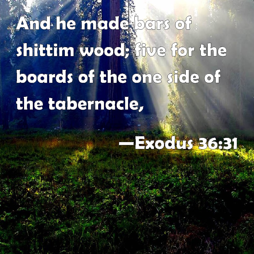 Choose a Background Exodus 36:31 And he made bars of shittim wood; five for the boards of the one side of the tabernacle, KJV: And he made bars of shittim wood; five for the boards of the one side of the tabernacle, DRB: He made also bars of setim wood, five to hold together the boards of one side of the tabernacle, DBT: And he made bars of acacia-wood: five for the boards of the one side of the tabernacle, ERV: And he made bars of acacia wood; five for the boards of the one side of the tabernacle, WBT: And he made bars of shittim wood; five for the boards of the one side of the tabernacle, WEB: He made bars of acacia wood; five for the boards of the one side of the tabernacle, YLT: And he maketh bars of shittim wood, five for the boards of the one side of the tabernacle,Links Exodus 36:31 NIV • Exodus 36:31 NLT • Exodus 36:31 ESV • Exodus 36:31 NASB • Exodus 36:31 KJV • Exodus 36:31 Interlinear • Exodus 36:31 Commentaries • Exodus 36:31 Parallel Texts • Exodus 36:31 Bible Apps • Exodus 36:31 Parallel • Bible Hub |