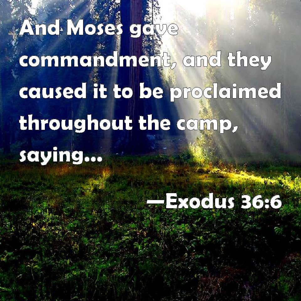 Choose a Background Exodus 36:6 And Moses gave commandment, and they caused it to be proclaimed throughout the camp, saying, Let neither man nor woman make any more work for the offering of the sanctuary. So the people were restrained from bringing. KJV: And Moses gave commandment, and they caused it to be proclaimed throughout the camp, saying, Let neither man nor woman make any more work for the offering of the sanctuary. So the people were restrained from bringing. DRB: Moses therefore commanded proclamation to be made by the crier's voice: Let neither man nor woman offer any more for the work of the sanctuary. And so they ceased from offering gifts, DBT: Then Moses gave commandment, and they caused it to be proclaimed through the camp, saying, Let neither man nor woman make any more work for the heave-offering of the sanctuary! So the people were restrained from bringing; ERV: And Moses gave commandment, and they caused it to be proclaimed throughout the camp, saying, Let neither man nor woman make any more work for the offering of the sanctuary. So the people were restrained from bringing. WBT: And Moses gave commandment, and they caused it to be proclaimed throughout the camp, saying, Let neither man nor woman make any more work for the offering of the sanctuary. So the people were restrained from bringing. WEB: Moses gave commandment, and they caused it to be proclaimed throughout the camp, saying, "Let neither man nor woman make anything else for the offering for the sanctuary." So the people were restrained from bringing. YLT: And Moses commandeth, and they cause a voice to pass over through the camp, saying, 'Let not man or woman make any more work for the heave-offering of the sanctuary;' and the people are restrained from bringing,Links Exodus 36:6 NIV • Exodus 36:6 NLT • Exodus 36:6 ESV • Exodus 36:6 NASB • Exodus 36:6 KJV • Exodus 36:6 Interlinear • Exodus 36:6 Commentaries • Exodus 36:6 Parallel Texts • Exodus 36:6 Bible Apps • Exodus 36:6 Parallel • Bible Hub |