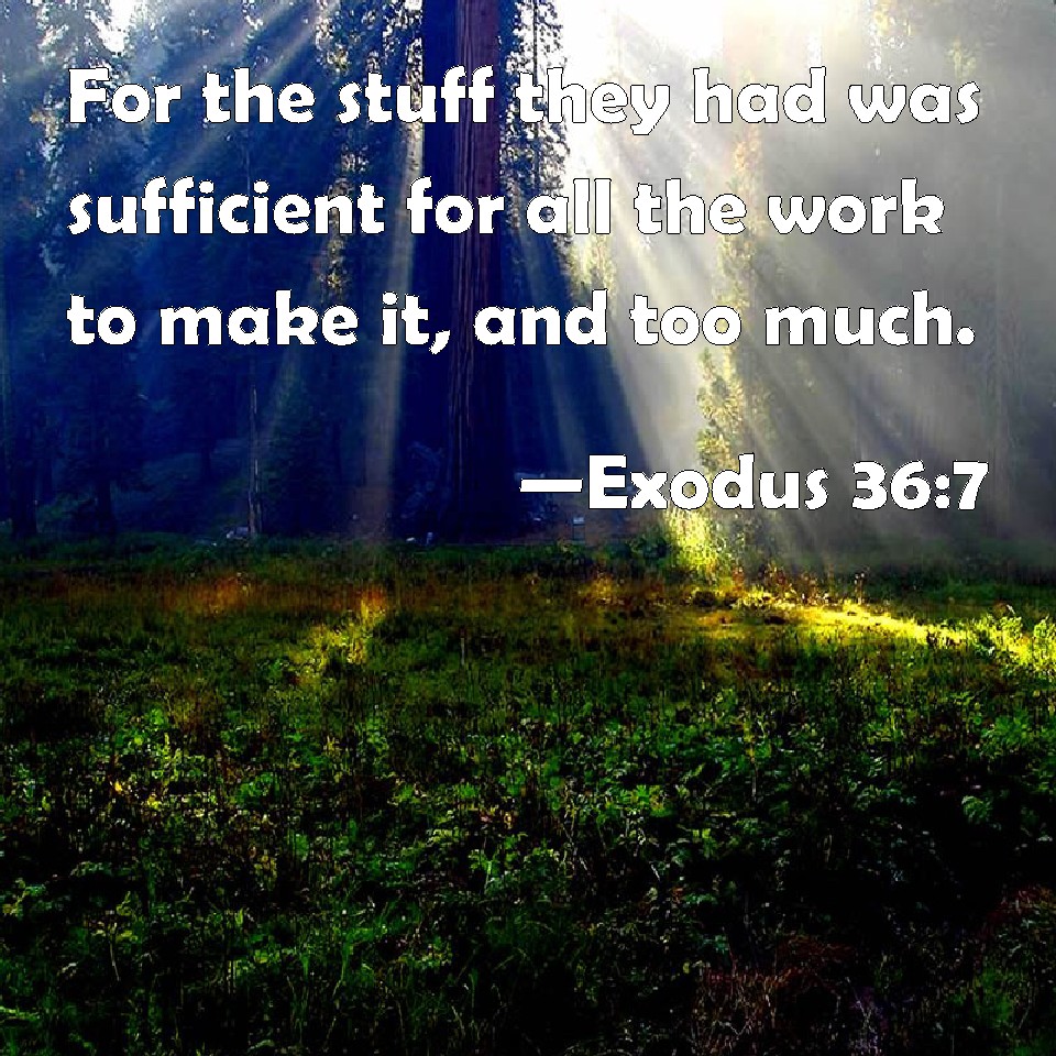 Choose a Background Exodus 36:7 For the stuff they had was sufficient for all the work to make it, and too much. KJV: For the stuff they had was sufficient for all the work to make it, and too much. DRB: Because the things that were offered did suffice, and were too much. DBT: for the work they had was sufficient for all the work to do it, and it was too much. ERV: For the stuff they had was sufficient for all the work to make it, and too much. WBT: For the stuff they had was sufficient for all the work to make it, and too much. WEB: For the stuff they had was sufficient for all the work to make it, and too much. YLT: and the work hath been sufficient for them, for all the work, to do it, and to leave.Links Exodus 36:7 NIV • Exodus 36:7 NLT • Exodus 36:7 ESV • Exodus 36:7 NASB • Exodus 36:7 KJV • Exodus 36:7 Interlinear • Exodus 36:7 Commentaries • Exodus 36:7 Parallel Texts • Exodus 36:7 Bible Apps • Exodus 36:7 Parallel • Bible Hub |