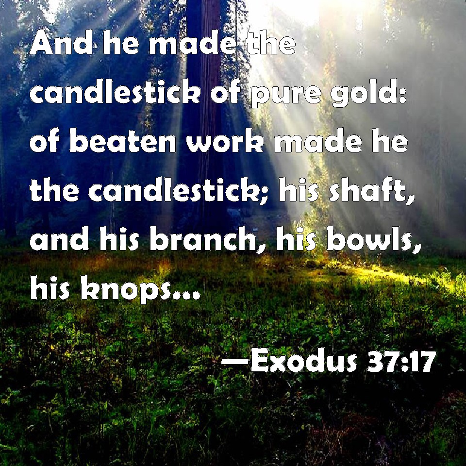 Choose a Background Exodus 37:17 And he made the candlestick of pure gold: of beaten work made he the candlestick; his shaft, and his branch, his bowls, his knops, and his flowers, were of the same: KJV: And he made the candlestick of pure gold: of beaten work made he the candlestick; his shaft, and his branch, his bowls, his knops, and his flowers, were of the same: DRB: He made also the candlestick of beaten work of the finest gold. From the shaft whereof its branches, its cups, and bowls, and lilies came out: DBT: And he made the candlestick of pure gold; of beaten work he made the candlestick: its base, and its shaft, its cups, its knobs, and its flowers were of itself. ERV: And he made the candlestick of pure gold: of beaten work made he the candlestick, even its base, and its shaft; its cups, its knops, and its flowers, were of one piece with it: WBT: And he made the candlestick of pure gold; of beaten work he made the candlestick; its shaft, and its branch, its bowls, its knobs, and its flowers were of the same: WEB: He made the lampstand of pure gold. He made the lampstand of beaten work. Its base, its shaft, its cups, its buds, and its flowers were of one piece with it. YLT: And he maketh the candlestick of pure gold; of beaten work he hath made the candlestick, its base, and its branch, its calyxes, its knops, and its flowers, have been of the same;Links Exodus 37:17 NIV • Exodus 37:17 NLT • Exodus 37:17 ESV • Exodus 37:17 NASB • Exodus 37:17 KJV • Exodus 37:17 Interlinear • Exodus 37:17 Commentaries • Exodus 37:17 Parallel Texts • Exodus 37:17 Bible Apps • Exodus 37:17 Parallel • Bible Hub |
