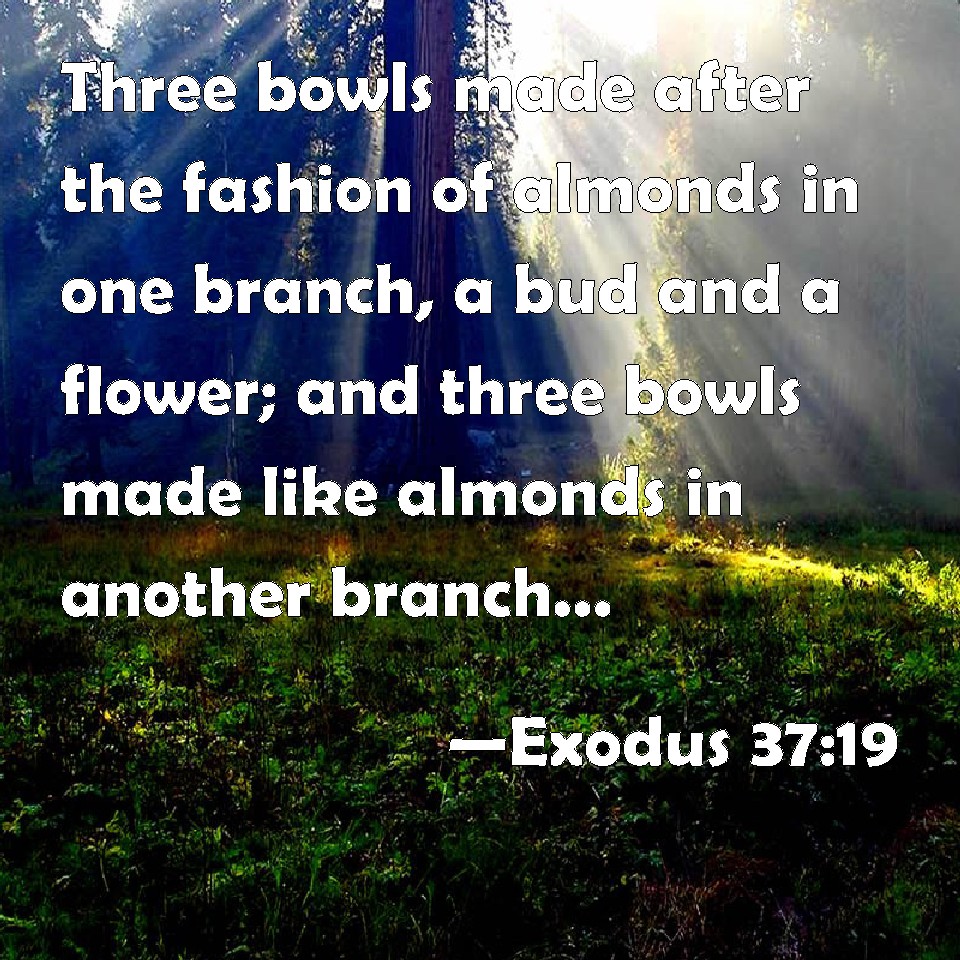 Choose a Background Exodus 37:19 Three bowls made after the fashion of almonds in one branch, a bud and a flower; and three bowls made like almonds in another branch, a bud and a flower: so throughout the six branches going out of the candlestick. KJV: Three bowls made after the fashion of almonds in one branch, a knop and a flower; and three bowls made like almonds in another branch, a knop and a flower: so throughout the six branches going out of the candlestick. DRB: Three cups in manner of a nut on each branch, and bowls withal and lilies; and three cups of the fashion of a nut in another branch, and bowls withal and lilies. The work of the six branches that went out from the shaft of the candlestick was equal. DBT: there were three cups shaped like almonds in the one branch, a knob and a flower; and three cups shaped like almonds in the other branch, a knob and a flower: so in the six branches which went out of the candlestick. ERV: three cups made like almond-blossoms in one branch, a knop and a flower; and three cups made like almond-blossoms in the other branch, a knop and a flower: so for the six branches going out of the candlestick. WBT: Three bowls made after the fashion of almonds in one branch, a knob and a flower; and three bowls made like almonds in another branch, a knob and a flower: so throughout the six branches proceeding from the candlestick. WEB: three cups made like almond blossoms in one branch, a bud and a flower, and three cups made like almond blossoms in the other branch, a bud and a flower: so for the six branches going out of the lampstand. YLT: three calyxes, made like almonds, in the one branch, a knop and a flower; and three calyxes, made like almonds, in another branch, a knop and a flower; so to the six branches which are coming out of the candlestick.Links Exodus 37:19 NIV • Exodus 37:19 NLT • Exodus 37:19 ESV • Exodus 37:19 NASB • Exodus 37:19 KJV • Exodus 37:19 Interlinear • Exodus 37:19 Commentaries • Exodus 37:19 Parallel Texts • Exodus 37:19 Bible Apps • Exodus 37:19 Parallel • Bible Hub |