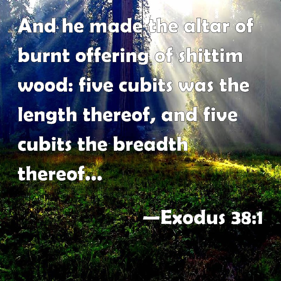 Choose a Background Exodus 38:1 And he made the altar of burnt offering of shittim wood: five cubits was the length thereof, and five cubits the breadth thereof; it was foursquare; and three cubits the height thereof. KJV: And he made the altar of burnt offering of shittim wood: five cubits was the length thereof, and five cubits the breadth thereof; it was foursquare; and three cubits the height thereof. DRB: He made also the altar of holocaust of setim wood, five cubits square, and three in height: DBT: And he made the altar of burnt-offering of acacia-wood; five cubits the length thereof, and five cubits the breadth thereof, square, and three cubits the height thereof. ERV: And he made the altar of burnt offering of acacia wood: five cubits was the length thereof, and five cubits the breadth thereof, foursquare; and three cubits the height thereof. WBT: And he made the altar of burnt-offering of shittim wood: five cubits was the length of it, and five cubits the breadth of it; it was foursquare; and its hight was three cubits. WEB: He made the altar of burnt offering of acacia wood. It was square. Its length was five cubits, its breadth was five cubits, and its height was three cubits. YLT: And he maketh the altar of burnt-offering of shittim wood, five cubits its length, and five cubits its breadth (square), and three cubits its height;Links Exodus 38:1 NIV • Exodus 38:1 NLT • Exodus 38:1 ESV • Exodus 38:1 NASB • Exodus 38:1 KJV • Exodus 38:1 Interlinear • Exodus 38:1 Commentaries • Exodus 38:1 Parallel Texts • Exodus 38:1 Bible Apps • Exodus 38:1 Parallel • Bible Hub |