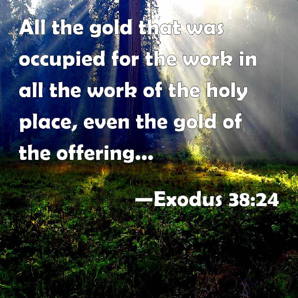 Choose a Background Exodus 38:24 All the gold that was occupied for the work in all the work of the holy place, even the gold of the offering, was twenty and nine talents, and seven hundred and thirty shekels, after the shekel of the sanctuary. KJV: All the gold that was occupied for the work in all the work of the holy place, even the gold of the offering, was twenty and nine talents, and seven hundred and thirty shekels, after the shekel of the sanctuary. DRB: All the gold that was spent in the work of the sanctuary, and that was offered in gifts was nine and twenty talents, and seven hundred and thirty sicles according to the standard of the sanctuary. DBT: All the gold that it took for the work in all the work of the sanctuary the gold of the wave-offering, was twenty-nine talents, and seven hundred and thirty shekels, according to the shekel of the sanctuary. ERV: All the gold that was used for the work in all the work of the sanctuary, even the gold of the offering, was twenty and nine talents, and seven hundred and thirty shekels, after the shekel of the sanctuary. WBT: All the gold that was occupied for the work in all the work of the holy place, even the gold of the offering, was twenty and nine talents, and seven hundred and thirty shekels, after the shekel of the sanctuary. WEB: All the gold that was used for the work in all the work of the sanctuary, even the gold of the offering, was twenty-nine talents, and seven hundred thirty shekels, after the shekel of the sanctuary. YLT: All the gold which is prepared for the work in all the work of the sanctuary (and it is the gold of the wave-offering) is twenty and nine talents, and seven hundred and thirty shekels, by the shekel of the sanctuary.Links Exodus 38:24 NIV • Exodus 38:24 NLT • Exodus 38:24 ESV • Exodus 38:24 NASB • Exodus 38:24 KJV • Exodus 38:24 Interlinear • Exodus 38:24 Commentaries • Exodus 38:24 Parallel Texts • Exodus 38:24 Bible Apps • Exodus 38:24 Parallel • Bible Hub |