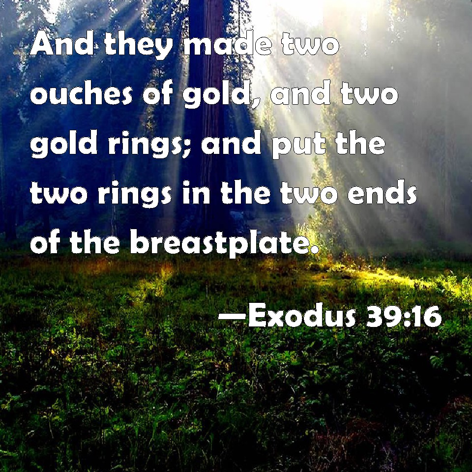 Choose a Background Exodus 39:16 And they made two ouches of gold, and two gold rings; and put the two rings in the two ends of the breastplate. KJV: And they made two ouches of gold, and two gold rings; and put the two rings in the two ends of the breastplate. DRB: And two hooks, and as many rings of gold. And they set the rings on either side of the rational, DBT: And they made two settings of gold, and two gold rings, and put the two rings on the two ends of the breastplate. ERV: And they made two ouches of gold, and two gold rings; and put the two rings on the two ends of the breastplate. WBT: And they made two ouches of gold, and two gold rings, and put the two rings in the two ends of the breast-plate. WEB: They made two settings of gold, and two gold rings, and put the two rings on the two ends of the breastplate. YLT: and they make two embroidered things of gold, and two rings of gold, and put the two rings on the two ends of the breastplate,Links Exodus 39:16 NIV • Exodus 39:16 NLT • Exodus 39:16 ESV • Exodus 39:16 NASB • Exodus 39:16 KJV • Exodus 39:16 Interlinear • Exodus 39:16 Commentaries • Exodus 39:16 Parallel Texts • Exodus 39:16 Bible Apps • Exodus 39:16 Parallel • Bible Hub |