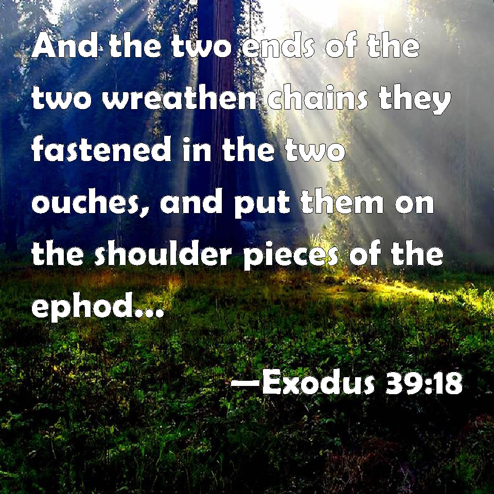 Choose a Background Exodus 39:18 And the two ends of the two wreathen chains they fastened in the two ouches, and put them on the shoulder pieces of the ephod, before it. KJV: And the two ends of the two wreathen chains they fastened in the two ouches, and put them on the shoulderpieces of the ephod, before it. DRB: These both before and behind so answered one another, that the ephod and the rational were bound together, DBT: and the two ends of the two wreathen cords they fastened to the two settings, and put them on the shoulder-pieces of the ephod, on the front thereof. ERV: And the other two ends of the two wreathen chains they put on the two ouches, and put them on the shoulderpieces of the ephod, in the forepart thereof. WBT: And the two ends of the two wreathed chains they fastened in the two ouches, and put them on the shoulder-pieces of the ephod, before it. WEB: The other two ends of the two braided chains they put on the two settings, and put them on the shoulder straps of the ephod, in its front. YLT: and the two ends of the two thick bands they have put on the two embroidered things, and they put them on the shoulders of the ephod, over-against its front.Links Exodus 39:18 NIV • Exodus 39:18 NLT • Exodus 39:18 ESV • Exodus 39:18 NASB • Exodus 39:18 KJV • Exodus 39:18 Interlinear • Exodus 39:18 Commentaries • Exodus 39:18 Parallel Texts • Exodus 39:18 Bible Apps • Exodus 39:18 Parallel • Bible Hub |