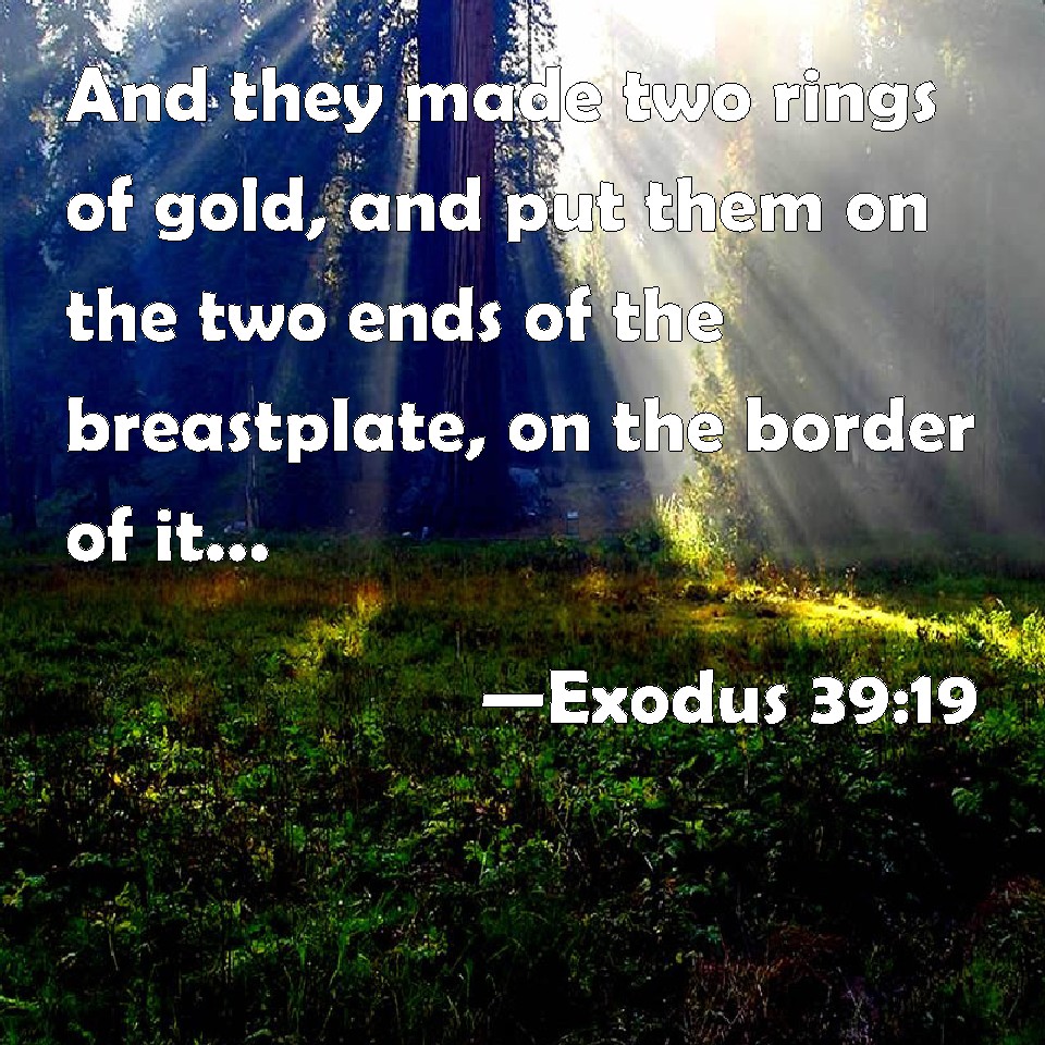 Choose a Background Exodus 39:19 And they made two rings of gold, and put them on the two ends of the breastplate, on the border of it, which was on the side of the ephod inward. KJV: And they made two rings of gold, and put them on the two ends of the breastplate, upon the border of it, which was on the side of the ephod inward. DRB: Being fastened to the girdle and strongly coupled with rings, which a violet fillet joined, lest they should flag loose, and be moved one from the other, as the Lord commanded Moses. DBT: And they made two rings of gold, and put them on the two ends of the breastplate, on the border thereof, which faceth the ephod inwards. ERV: And they made two rings of gold, and put them upon the two ends of the breastplate, upon the edge thereof, which was toward the side of the ephod inward. WBT: And they made two rings of gold, and put them on the two ends of the breast-plate, upon the border of it, which was on the side of the ephod inward. WEB: They made two rings of gold, and put them on the two ends of the breastplate, on its edge, which was toward the side of the ephod inward. YLT: And they make two rings of gold, and set them on the two ends of the breastplate, on its border, which is on the side of the ephod within;Links Exodus 39:19 NIV • Exodus 39:19 NLT • Exodus 39:19 ESV • Exodus 39:19 NASB • Exodus 39:19 KJV • Exodus 39:19 Interlinear • Exodus 39:19 Commentaries • Exodus 39:19 Parallel Texts • Exodus 39:19 Bible Apps • Exodus 39:19 Parallel • Bible Hub |