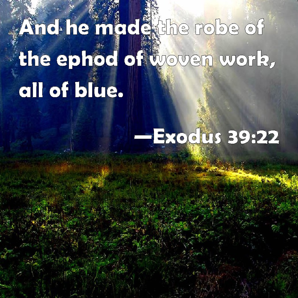 Choose a Background Exodus 39:22 And he made the robe of the ephod of woven work, all of blue. KJV: And he made the robe of the ephod of woven work, all of blue. DRB: And beneath at the feet pomegranates of violet, purple, scarlet, and fine twisted linen: DBT: And he made the cloak of the ephod of woven work, all of blue; ERV: And he made the robe of the ephod of woven work, all of blue; WBT: And he made the robe of the ephod of woven work, all of blue. WEB: He made the robe of the ephod of woven work, all of blue. YLT: And he maketh the upper robe of the ephod, work of a weaver, completely of blue;Links Exodus 39:22 NIV • Exodus 39:22 NLT • Exodus 39:22 ESV • Exodus 39:22 NASB • Exodus 39:22 KJV • Exodus 39:22 Interlinear • Exodus 39:22 Commentaries • Exodus 39:22 Parallel Texts • Exodus 39:22 Bible Apps • Exodus 39:22 Parallel • Bible Hub |