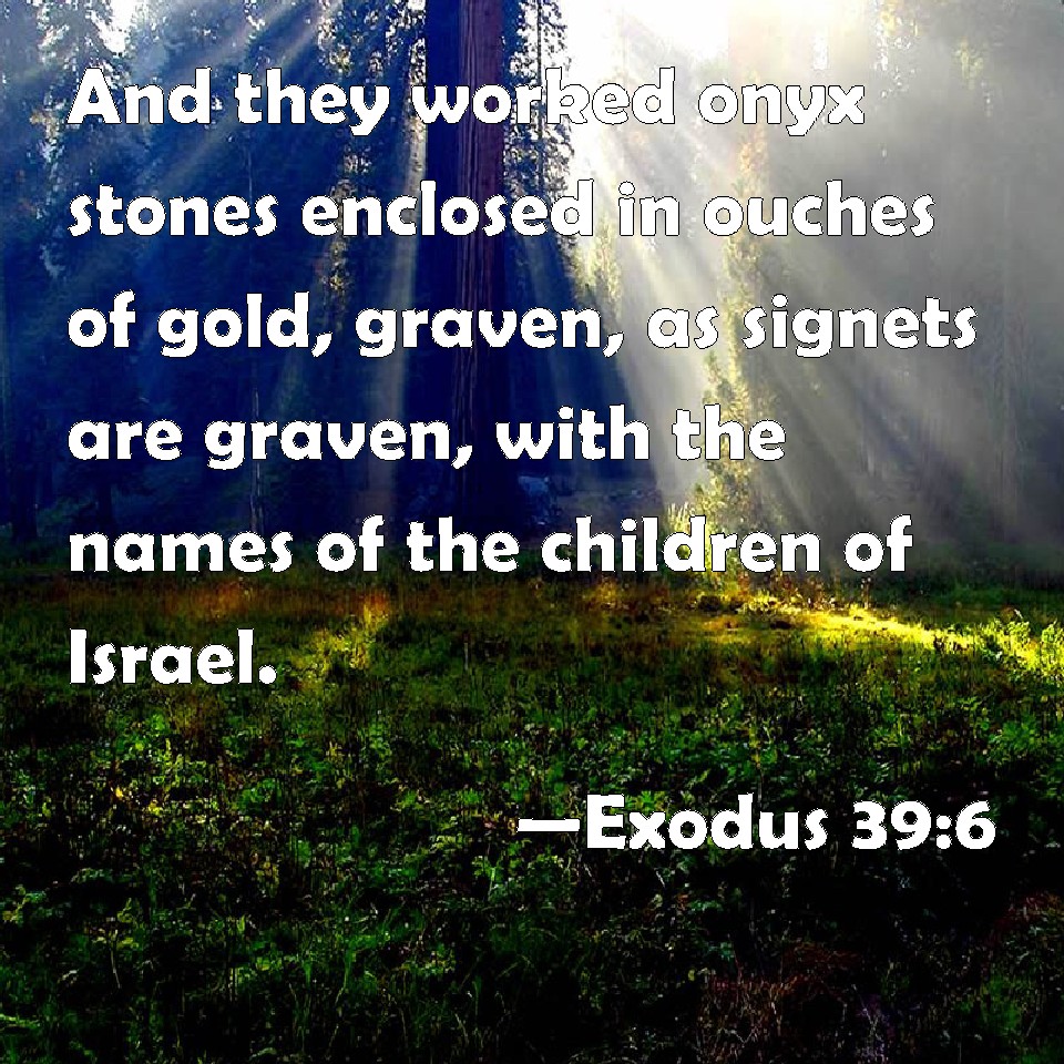 Choose a Background Exodus 39:6 And they worked onyx stones enclosed in ouches of gold, graven, as signets are graven, with the names of the children of Israel. KJV: And they wrought onyx stones inclosed in ouches of gold, graven, as signets are graven, with the names of the children of Israel. DRB: He prepared also two onyx stones, fast set and closed in gold, and graven by the art of a lapidary, with the names of the children of Israel: DBT: And they wrought the onyx stones mounted in enclosures of gold, engraved with the engravings of a seal, according to the names of the sons of Israel. ERV: And they wrought the onyx stones, enclosed in ouches of gold, graven with the engravings of a signet, according to the names of the children of Israel. WBT: And they wrought onyx stones inclosed in ouches of gold, graven as signets are graven, with the names of the children of Israel. WEB: They worked the onyx stones, enclosed in settings of gold, engraved with the engravings of a signet, according to the names of the children of Israel. YLT: And they prepare the shoham stones, set, embroidered with gold, opened with openings of a signet, by the names of the sons of Israel;Links Exodus 39:6 NIV • Exodus 39:6 NLT • Exodus 39:6 ESV • Exodus 39:6 NASB • Exodus 39:6 KJV • Exodus 39:6 Interlinear • Exodus 39:6 Commentaries • Exodus 39:6 Parallel Texts • Exodus 39:6 Bible Apps • Exodus 39:6 Parallel • Bible Hub |