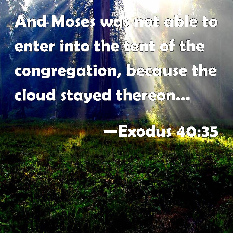 Choose a Background Exodus 40:35 And Moses was not able to enter into the tent of the congregation, because the cloud stayed thereon, and the glory of the LORD filled the tabernacle. KJV: And Moses was not able to enter into the tent of the congregation, because the cloud abode thereon, and the glory of the LORD filled the tabernacle. DRB: Neither could Moses go into the tabernacle of the covenant, the cloud covering all things and the majesty of the Lord shining, for the cloud had covered all. DBT: And Moses could not enter into the tent of meeting, for the cloud abode on it, and the glory of Jehovah filled the tabernacle. ERV: And Moses was not able to enter into the tent of meeting, because the cloud abode thereon, and the glory of the LORD filled the tabernacle. WBT: And Moses was not able to enter into the tent of the congregation, because the cloud abode upon it, and the glory of the LORD filled the tabernacle. WEB: Moses wasn't able to enter into the Tent of Meeting, because the cloud stayed on it, and Yahweh's glory filled the tabernacle. YLT: and Moses hath not been able to go in unto the tent of meeting, for the cloud hath tabernacled on it, and the honour of Jehovah hath filled the tabernacle.Links Exodus 40:35 NIV • Exodus 40:35 NLT • Exodus 40:35 ESV • Exodus 40:35 NASB • Exodus 40:35 KJV • Exodus 40:35 Interlinear • Exodus 40:35 Commentaries • Exodus 40:35 Parallel Texts • Exodus 40:35 Bible Apps • Exodus 40:35 Parallel • Bible Hub |
