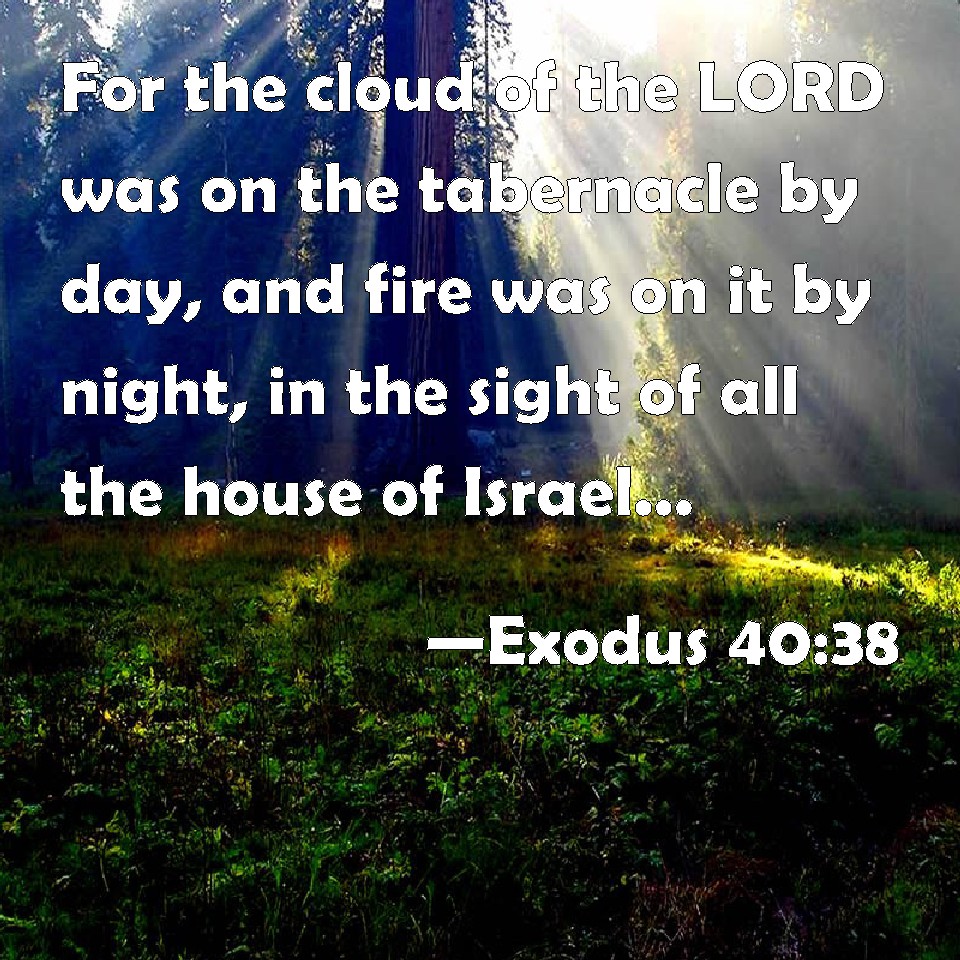 Choose a Background Exodus 40:38 For the cloud of the LORD was on the tabernacle by day, and fire was on it by night, in the sight of all the house of Israel, throughout all their journeys. KJV: For the cloud of the LORD was upon the tabernacle by day, and fire was on it by night, in the sight of all the house of Israel, throughout all their journeys. DRB: For the cloud of the Lord hung over the tabernacle by day, and a fire by night, in the sight of all the children of Israel throughout all their mansions. DBT: For the cloud of Jehovah was on the tabernacle by day, and fire was in it by night, before the eyes of all the house of Israel, throughout all their journeys. ERV: For the cloud of the LORD was upon the tabernacle by day, and there was fire therein by night, in the sight of all the house of Israel, throughout all their journeys. WBT: For the cloud of the LORD was upon the tabernacle by day, and fire was on it by night, in the sight of all the house of Israel, throughout all their journeys. WEB: For the cloud of Yahweh was on the tabernacle by day, and there was fire in the cloud by night, in the sight of all the house of Israel, throughout all their journeys. YLT: for the cloud of Jehovah is on the tabernacle by day, and fire is in it by night, before the eyes of all the house of Israel in all their journeys.Links Exodus 40:38 NIV • Exodus 40:38 NLT • Exodus 40:38 ESV • Exodus 40:38 NASB • Exodus 40:38 KJV • Exodus 40:38 Interlinear • Exodus 40:38 Commentaries • Exodus 40:38 Parallel Texts • Exodus 40:38 Bible Apps • Exodus 40:38 Parallel • Bible Hub |