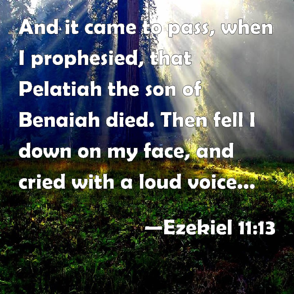 Choose a Background Ezekiel 11:13 And it came to pass, when I prophesied, that Pelatiah the son of Benaiah died. Then fell I down on my face, and cried with a loud voice, and said, Ah Lord GOD! will you make a full end of the remnant of Israel? KJV: And it came to pass, when I prophesied, that Pelatiah the son of Benaiah died. Then fell I down upon my face, and cried with a loud voice, and said, Ah Lord GOD! wilt thou make a full end of the remnant of Israel? DRB: And it came to pass, when I prophesied, that Pheltias the son of Banaias died: and I fell down upon my face, and cried with a loud voice: and said: Alas, alas, alas, O Lord God: wilt thou make an end of all the remnant of Israel? DBT: And it came to pass, when I prophesied, that Pelatiah the son of Benaiah died. And I fell down on my face, and cried with a loud voice, and said, Ah, Lord Jehovah! wilt thou make a full end of the remnant of Israel? ERV: And it came to pass, when I prophesied, that Pelatiah the son of Benaiah died. Then fell I down upon my face, and cried with a loud voice, and said, Ah Lord GOD! wilt thou make a full end of the remnant of Israel? WBT: And it came to pass, when I prophesied, that Pelatiah the son of Benaiah died. Then I fell down upon my face, and cried with a loud voice, and said, Ah Lord GOD! wilt thou make a full end of the remnant of Israel? WEB: It happened, when I prophesied, that Pelatiah the son of Benaiah died. Then fell I down on my face, and cried with a loud voice, and said, Ah Lord Yahweh! will you make a full end of the remnant of Israel? YLT: And it cometh to pass, at my prophesying, that Pelatiah son of Benaiah is dying, and I fall on my face, and cry — a loud voice — and say, 'Ah, Lord Jehovah, an end Thou art making of the remnant of Israel.'Links Ezekiel 11:13 NIV • Ezekiel 11:13 NLT • Ezekiel 11:13 ESV • Ezekiel 11:13 NASB • Ezekiel 11:13 KJV • Ezekiel 11:13 Interlinear • Ezekiel 11:13 Commentaries • Ezekiel 11:13 Parallel Texts • Ezekiel 11:13 Bible Apps • Ezekiel 11:13 Parallel • Bible Hub |