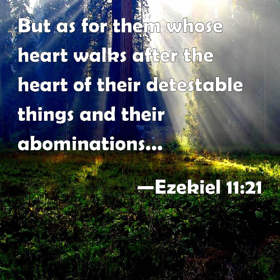 Choose a Background Ezekiel 11:21 But as for them whose heart walks after the heart of their detestable things and their abominations, I will recompense their way on their own heads, said the Lord GOD. KJV: But as for them whose heart walketh after the heart of their detestable things and their abominations, I will recompense their way upon their own heads, saith the Lord GOD. DRB: But as for them whose heart walketh after their scandals and abominations, I will lay their way upon their head, saith the Lord God. DBT: But as for them whose heart walketh well-pleased with their detestable things and their abominations, I will recompense their way upon their heads, saith the Lord Jehovah. ERV: But as for them whose heart walketh after the heart of their detestable things and their abominations, I will bring their way upon their own heads, saith the Lord GOD. WBT: But as for them whose heart walketh after the heart of their detestable things and their abominations, I will recompense their way upon their own heads, saith the Lord GOD. WEB: But as for them whose heart walks after the heart of their detestable things and their abominations, I will bring their way on their own heads, says the Lord Yahweh. YLT: As to those whose heart is going unto the heart Of their detestable and their abominable things, Their way on their head I have put, An affirmation of the Lord Jehovah.'Links Ezekiel 11:21 NIV • Ezekiel 11:21 NLT • Ezekiel 11:21 ESV • Ezekiel 11:21 NASB • Ezekiel 11:21 KJV • Ezekiel 11:21 Interlinear • Ezekiel 11:21 Commentaries • Ezekiel 11:21 Parallel Texts • Ezekiel 11:21 Bible Apps • Ezekiel 11:21 Parallel • Bible Hub |