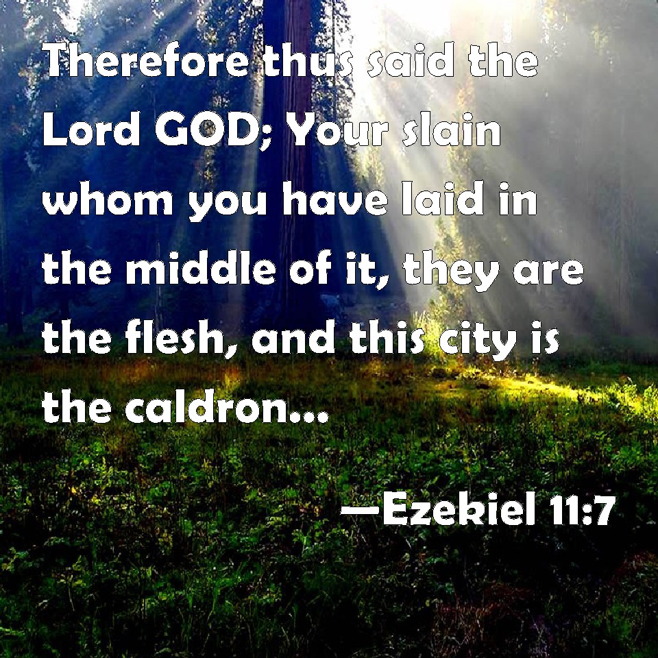 Choose a Background Ezekiel 11:7 Therefore thus said the Lord GOD; Your slain whom you have laid in the middle of it, they are the flesh, and this city is the caldron: but I will bring you forth out of the middle of it. KJV: Therefore thus saith the Lord GOD; Your slain whom ye have laid in the midst of it, they are the flesh, and this city is the caldron: but I will bring you forth out of the midst of it. DRB: Therefore thus saith the Lord God: Your slain, whom you have laid in the midst thereof, they are the flesh, and this is the caldron: and I will bring you forth out of the midst thereof. DBT: Therefore thus saith the Lord Jehovah: Your slain whom ye have laid in the midst of it, they are the flesh, and it is the cauldron; but you will I bring forth out of the midst of it. ERV: Therefore thus saith the Lord GOD: Your slain whom ye have laid in the midst of it, they are the flesh, and this city is the caldron: but ye shall be brought forth out of the midst of it. WBT: Therefore thus saith the Lord GOD; Your slain whom ye have laid in the midst of it, they are the flesh, and this city is the caldron: but I will bring you forth out of the midst of it. WEB: Therefore thus says the Lord Yahweh: Your slain whom you have laid in its midst, they are the flesh, and this [city] is the caldron; but you shall be brought forth out of its midst. YLT: Therefore, thus said the Lord Jehovah: Your wounded whom ye placed in its midst, They are the flesh, and it is the pot, And you he hath brought out from its midst.Links Ezekiel 11:7 NIV • Ezekiel 11:7 NLT • Ezekiel 11:7 ESV • Ezekiel 11:7 NASB • Ezekiel 11:7 KJV • Ezekiel 11:7 Interlinear • Ezekiel 11:7 Commentaries • Ezekiel 11:7 Parallel Texts • Ezekiel 11:7 Bible Apps • Ezekiel 11:7 Parallel • Bible Hub |