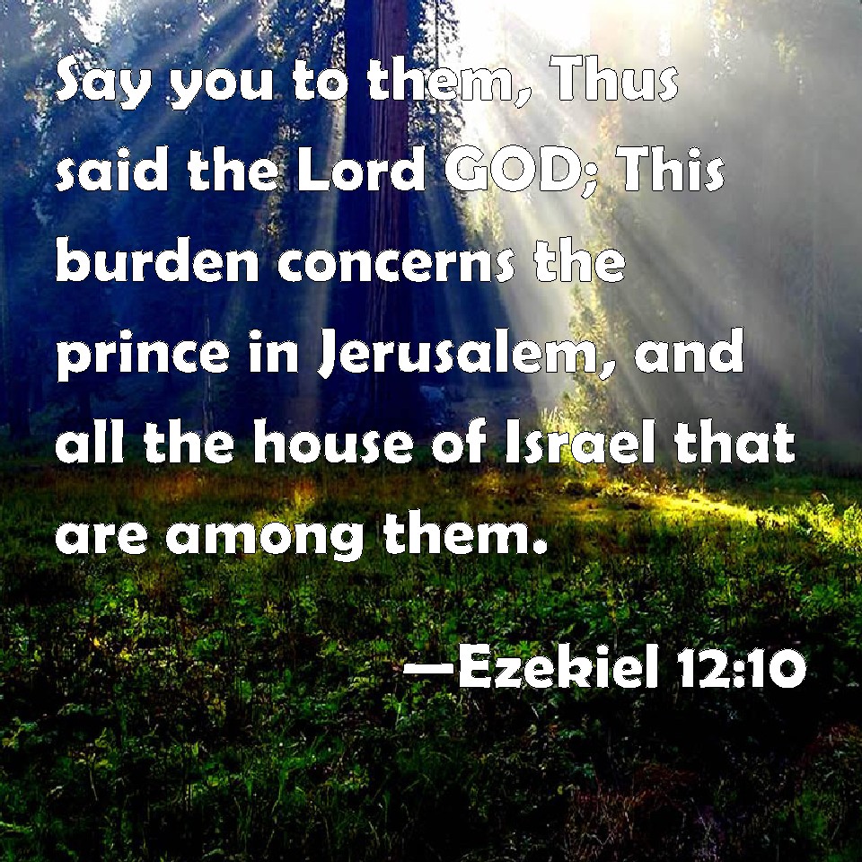 Choose a Background Ezekiel 12:10 Say you to them, Thus said the Lord GOD; This burden concerns the prince in Jerusalem, and all the house of Israel that are among them. KJV: Say thou unto them, Thus saith the Lord GOD; This burden concerneth the prince in Jerusalem, and all the house of Israel that are among them. DRB: Say to them: Thus saith the Lord God: This burden concerneth my prince that is in Jerusalem, and all the house of Israel, that are among them. DBT: Say unto them, Thus saith the Lord Jehovah: This burden concerneth the prince in Jerusalem, and all the house of Israel that are among them. ERV: Say thou unto them, Thus saith the Lord GOD: This burden concerneth the prince in Jerusalem, and all the house of Israel among whom they are. WBT: Say thou to them, Thus saith the Lord GOD, This burden concerneth the prince in Jerusalem, and all the house of Israel that are among them. WEB: Say to them, Thus says the Lord Yahweh: This burden [concerns] the prince in Jerusalem, and all the house of Israel among whom they are. YLT: say unto them, Thus said the Lord Jehovah: 'The prince is this burden in Jerusalem, and all the house of Israel who are in their midst.Links Ezekiel 12:10 NIV • Ezekiel 12:10 NLT • Ezekiel 12:10 ESV • Ezekiel 12:10 NASB • Ezekiel 12:10 KJV • Ezekiel 12:10 Interlinear • Ezekiel 12:10 Commentaries • Ezekiel 12:10 Parallel Texts • Ezekiel 12:10 Bible Apps • Ezekiel 12:10 Parallel • Bible Hub |
