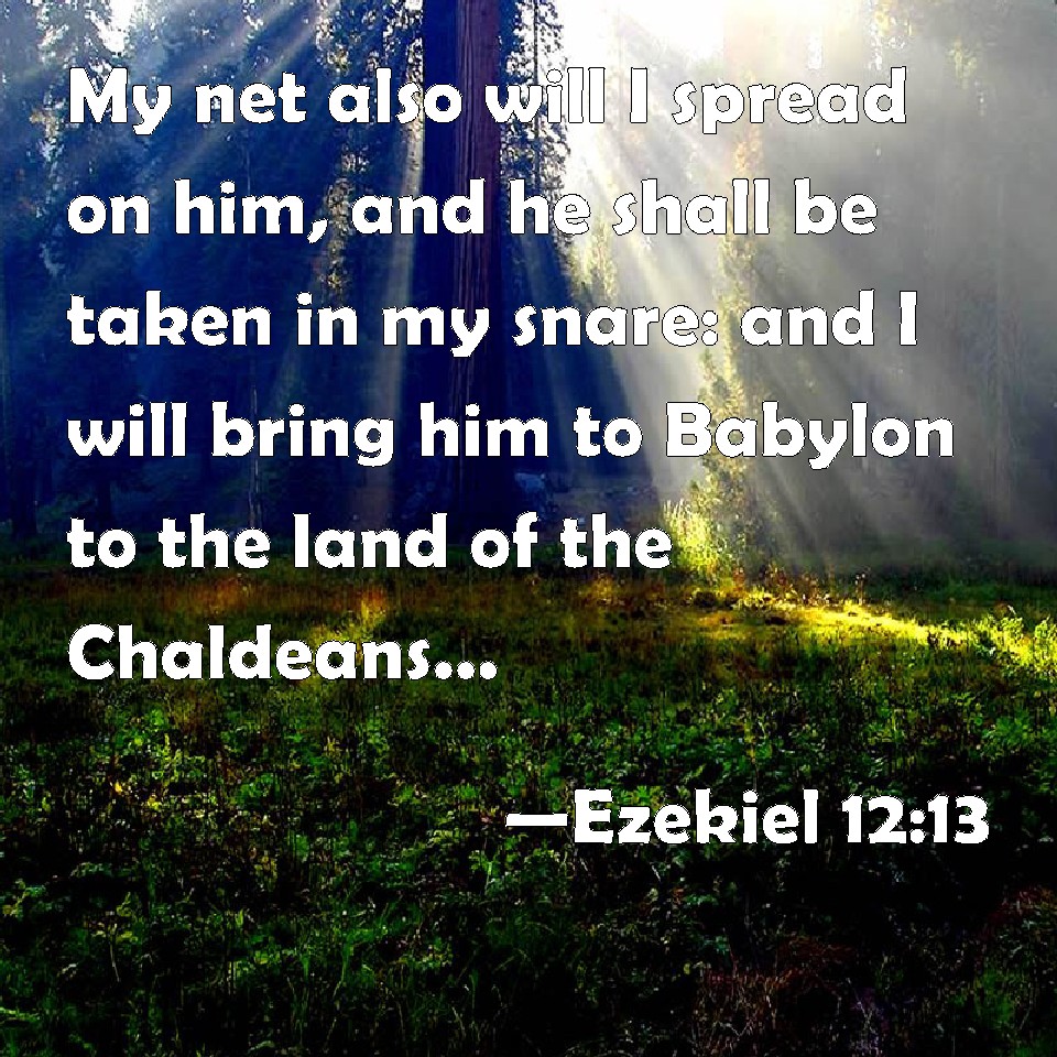 Choose a Background Ezekiel 12:13 My net also will I spread on him, and he shall be taken in my snare: and I will bring him to Babylon to the land of the Chaldeans; yet shall he not see it, though he shall die there. KJV: My net also will I spread upon him, and he shall be taken in my snare: and I will bring him to Babylon to the land of the Chaldeans; yet shall he not see it, though he shall die there. DRB: And I will spread my net over him, and he shall be taken in my net: and I will bring him into Babylon, into the land of the Chaldeans, and he shall not see it, and there he shall die. DBT: And I will spread my net upon him, and he shall be taken in my snare; and I will bring him to Babylon to the land of the Chaldeans; but he shall not see it, and there shall he die. ERV: My net also will I spread upon him, and he shall be taken in my snare: and I will bring him to Babylon to the land of the Chaldeans; yet shall he not see it, though he shall die there. WBT: My net also will I spread upon him, and he shall be taken in my snare: and I will bring him to Babylon to the land of the Chaldeans, yet shall he not see it, though he shall die there. WEB: My net also will I spread on him, and he shall be taken in my snare; and I will bring him to Babylon to the land of the Chaldeans; yet shall he not see it, though he shall die there. YLT: And I have spread My net for him, and he hath been caught in My snare, and I have brought him in to Babylon, the land of the Chaldeans, and it he doth not see — and there doth he die.Links Ezekiel 12:13 NIV • Ezekiel 12:13 NLT • Ezekiel 12:13 ESV • Ezekiel 12:13 NASB • Ezekiel 12:13 KJV • Ezekiel 12:13 Interlinear • Ezekiel 12:13 Commentaries • Ezekiel 12:13 Parallel Texts • Ezekiel 12:13 Bible Apps • Ezekiel 12:13 Parallel • Bible Hub |