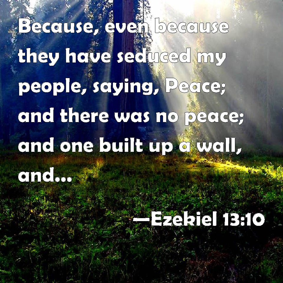 Choose a Background Ezekiel 13:10 Because, even because they have seduced my people, saying, Peace; and there was no peace; and one built up a wall, and, see, others daubed it with untempered mortar: KJV: Because, even because they have seduced my people, saying, Peace; and there was no peace; and one built up a wall, and, lo, others daubed it with untempered morter: DRB: Because they have deceived my people, saying: Peace, and there is no peace: and the people built up a wall, and they daubed it with dirt without straw. DBT: Because, yea because they have seduced my people, saying, Peace! and there is no peace; and one buildeth up a wall, and lo, they daub it with untempered mortar — ERV: Because, even because they have seduced my people, saying, Peace; and there is no peace; and when one buildeth up a wall, behold, they daub it with untempered mortar: WBT: Because, even because they have seduced my people, saying, Peace; and there was no peace; and one built up a wall, and lo, others daubed it with untempered mortar: WEB: Because, even because they have seduced my people, saying, Peace; and there is no peace; and when one builds up a wall, behold, they plaster it with whitewash: YLT: Because, even because, they did cause My people to err, Saying, Peace! and there is no peace, And that one is building a wall, And lo, they are daubing it with chalk.Links Ezekiel 13:10 NIV • Ezekiel 13:10 NLT • Ezekiel 13:10 ESV • Ezekiel 13:10 NASB • Ezekiel 13:10 KJV • Ezekiel 13:10 Interlinear • Ezekiel 13:10 Commentaries • Ezekiel 13:10 Parallel Texts • Ezekiel 13:10 Bible Apps • Ezekiel 13:10 Parallel • Bible Hub |