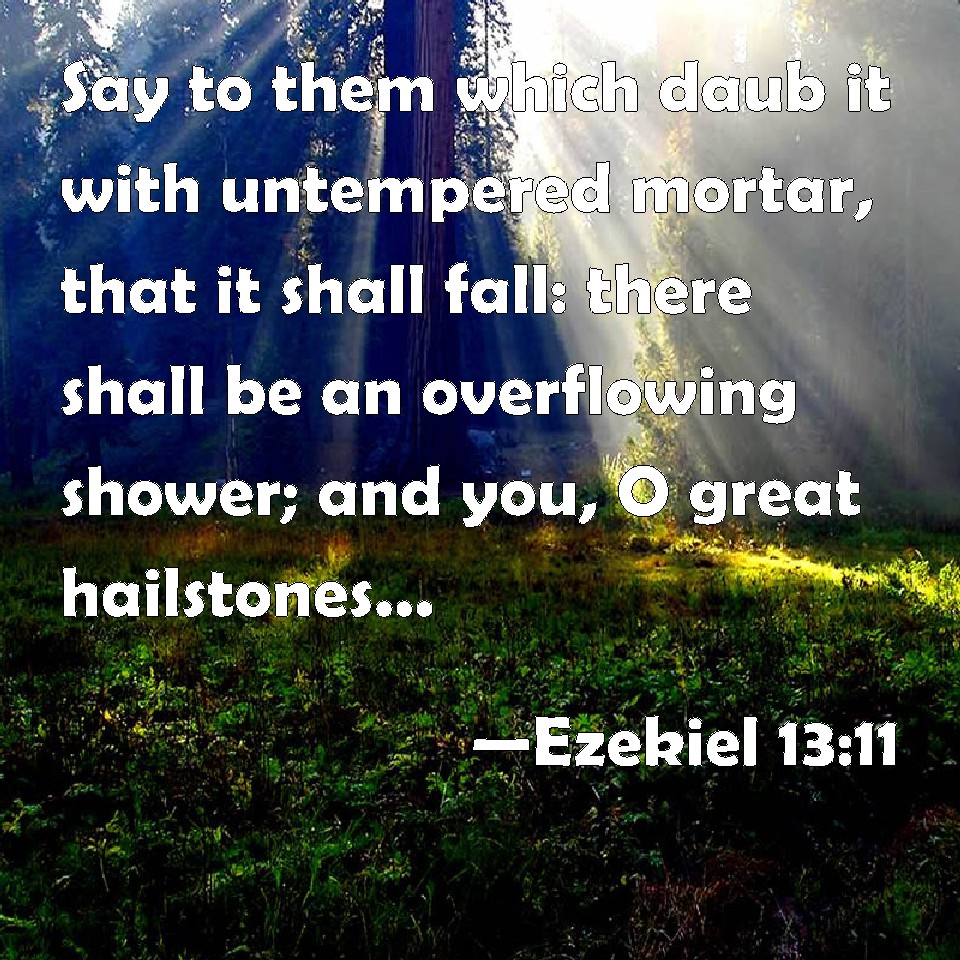 Choose a Background Ezekiel 13:11 Say to them which daub it with untempered mortar, that it shall fall: there shall be an overflowing shower; and you, O great hailstones, shall fall; and a stormy wind shall rend it. KJV: Say unto them which daub it with untempered morter, that it shall fall: there shall be an overflowing shower; and ye, O great hailstones, shall fall; and a stormy wind shall rend it. DRB: Say to them that daub without tempering, that it shall fall: for there shall be an overflowing shower, and I will cause great hailstones to fall violently from above, and a stormy wind to throw it down. DBT: say unto them which daub it with untempered mortar that it shall fall: there shall be an overflowing rain, and ye, O great hailstones, shall fall, and a stormy wind shall burst forth. ERV: say unto them which daub it with untempered mortar, that it shall fall: there shall be an overflowing shower; and ye, O great hailstones, shall fall; and a stormy wind shall rend it. WBT: Say to them who daub it with untempered mortar, that it shall fall: there shall be an overflowing shower; and ye, O great hailstones, shall fall; and a stormy wind shall rend it. WEB: tell those who plaster it with whitewash, that it shall fall: there shall be an overflowing shower; and you, great hailstones, shall fall; and a stormy wind shall tear it. YLT: Say to those daubing with chalk — It falleth, There hath been an overflowing shower, And ye, O hailstones, do fall, And a tempestuous wind doth rend,Links Ezekiel 13:11 NIV • Ezekiel 13:11 NLT • Ezekiel 13:11 ESV • Ezekiel 13:11 NASB • Ezekiel 13:11 KJV • Ezekiel 13:11 Interlinear • Ezekiel 13:11 Commentaries • Ezekiel 13:11 Parallel Texts • Ezekiel 13:11 Bible Apps • Ezekiel 13:11 Parallel • Bible Hub |