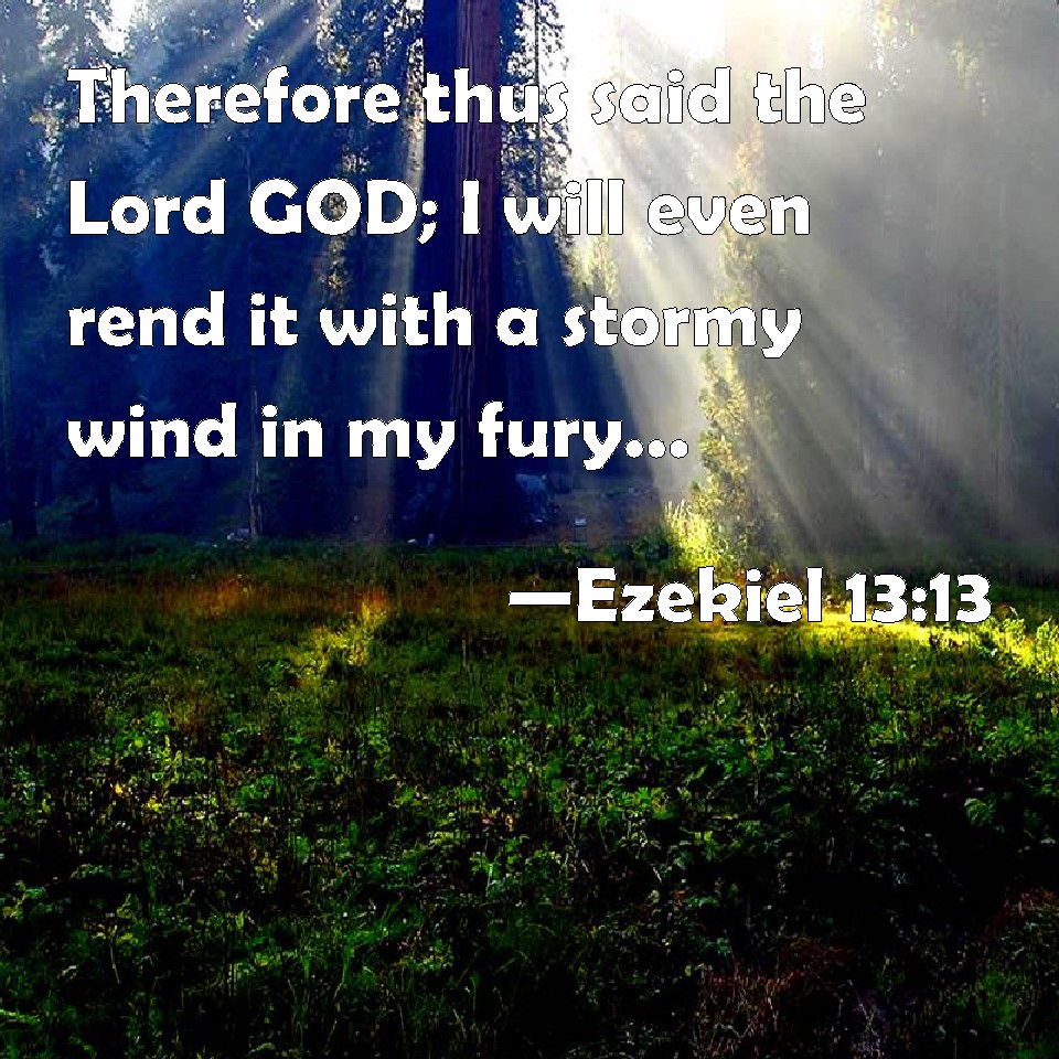 Choose a Background Ezekiel 13:13 Therefore thus said the Lord GOD; I will even rend it with a stormy wind in my fury; and there shall be an overflowing shower in my anger, and great hailstones in my fury to consume it. KJV: Therefore thus saith the Lord GOD; I will even rend it with a stormy wind in my fury; and there shall be an overflowing shower in mine anger, and great hailstones in my fury to consume it. DRB: Therefore thus saith the Lord God: Lo, I will cause a stormy wind to break forth in my indignation, and there shall be an overflowing shower in my anger: and great hailstones in my wrath to consume. DBT: Therefore thus saith the Lord Jehovah: I will cause to burst forth a stormy wind in my fury; and there shall be an overflowing rain in mine anger, and hail-stones in fury for utter destruction. ERV: Therefore thus saith the Lord GOD; I will even rend it with a stormy wind in my fury; and there shall be an overflowing shower in mine anger, and great hailstones in fury to consume it. WBT: Therefore thus saith the Lord GOD; I will even rend it with a stormy wind in my fury; and there shall be an overflowing shower in my anger, and great hailstones in my fury to consume it. WEB: Therefore thus says the Lord Yahweh: I will even tear it with a stormy wind in my wrath; and there shall be an overflowing shower in my anger, and great hailstones in wrath to consume it. YLT: Therefore, thus said the Lord Jehovah: I have rent with a tempestuous wind in My fury, And an overflowing shower is in Mine anger, And hailstones in My fury — to consume.Links Ezekiel 13:13 NIV • Ezekiel 13:13 NLT • Ezekiel 13:13 ESV • Ezekiel 13:13 NASB • Ezekiel 13:13 KJV • Ezekiel 13:13 Interlinear • Ezekiel 13:13 Commentaries • Ezekiel 13:13 Parallel Texts • Ezekiel 13:13 Bible Apps • Ezekiel 13:13 Parallel • Bible Hub |