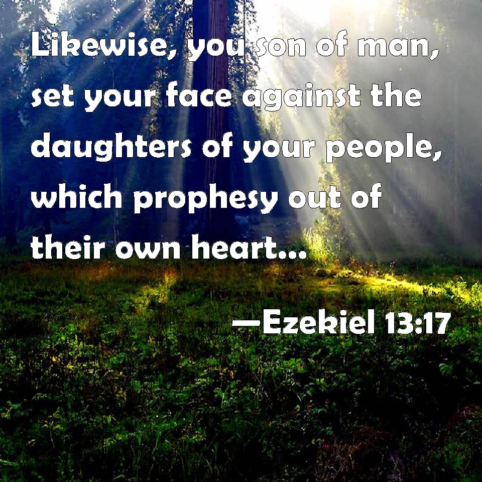 Choose a Background Ezekiel 13:17 Likewise, you son of man, set your face against the daughters of your people, which prophesy out of their own heart; and prophesy you against them, KJV: Likewise, thou son of man, set thy face against the daughters of thy people, which prophesy out of their own heart; and prophesy thou against them, DRB: And thou, son of man, set thy face against the daughters of thy people that prophesy out of their own heart: and do thou prophesy against them, DBT: And thou, son of man, set thy face against the daughters of thy people, who prophesy out of their own heart; and prophesy against them, ERV: And thou, son of man, set thy face against the daughters of thy people, which prophesy out of their own heart; and prophesy thou against them, WBT: Likewise, thou son of man, set thy face against the daughters of thy people, who prophesy out of their own heart; and prophesy thou against them, WEB: You, son of man, set your face against the daughters of your people, who prophesy out of their own heart; and prophesy against them, YLT: And thou, son of man, set thy face against the daughters of thy people, who are prophesying out of their own heart, and prophesy concerning them,Links Ezekiel 13:17 NIV • Ezekiel 13:17 NLT • Ezekiel 13:17 ESV • Ezekiel 13:17 NASB • Ezekiel 13:17 KJV • Ezekiel 13:17 Interlinear • Ezekiel 13:17 Commentaries • Ezekiel 13:17 Parallel Texts • Ezekiel 13:17 Bible Apps • Ezekiel 13:17 Parallel • Bible Hub |
