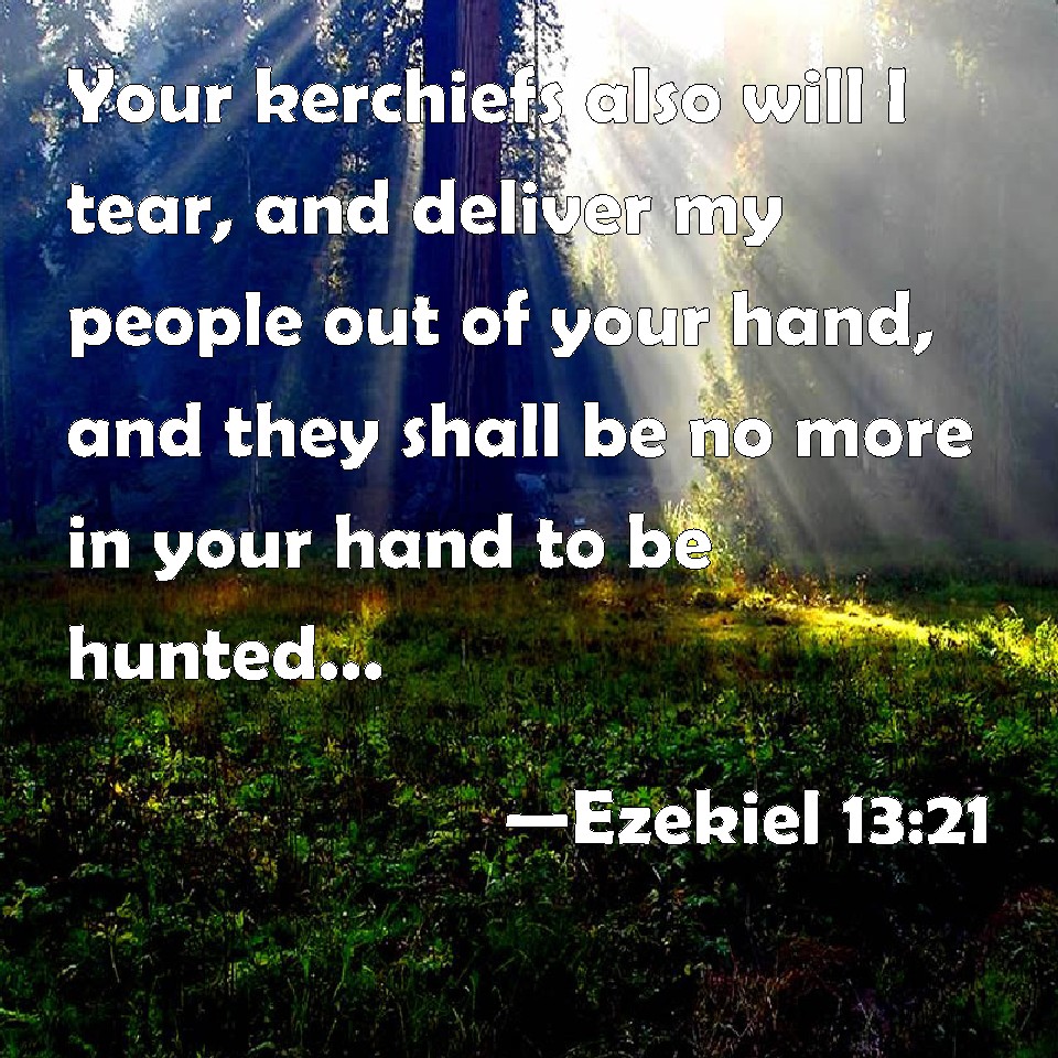 Choose a Background Ezekiel 13:21 Your kerchiefs also will I tear, and deliver my people out of your hand, and they shall be no more in your hand to be hunted; and you shall know that I am the LORD. KJV: Your kerchiefs also will I tear, and deliver my people out of your hand, and they shall be no more in your hand to be hunted; and ye shall know that I am the LORD. DRB: And I will tear your pillows, and will deliver my people out of your hand, neither shall they be any more in your hands to be a prey: and you shall know that I am the Lord. DBT: And I will tear your veils and deliver my people out of your hand, and they shall be no more in your hand to be hunted; and ye shall know that I am Jehovah. ERV: Your kerchiefs also will I tear, and deliver my people out of your hand, and they shall be no more in your hand to be hunted; and ye shall know that I am the LORD. WBT: Your kerchiefs also will I tear, and deliver my people out of your hand, and they shall no more be in your hand to be hunted; and ye shall know that I am the LORD. WEB: Your kerchiefs also will I tear, and deliver my people out of your hand, and they shall be no more in your hand to be hunted; and you shall know that I am Yahweh. YLT: And I have torn your kerchiefs, And delivered My people out of your hand, And they are no more in your hand for a prey, And ye have known that I am Jehovah.Links Ezekiel 13:21 NIV • Ezekiel 13:21 NLT • Ezekiel 13:21 ESV • Ezekiel 13:21 NASB • Ezekiel 13:21 KJV • Ezekiel 13:21 Interlinear • Ezekiel 13:21 Commentaries • Ezekiel 13:21 Parallel Texts • Ezekiel 13:21 Bible Apps • Ezekiel 13:21 Parallel • Bible Hub |