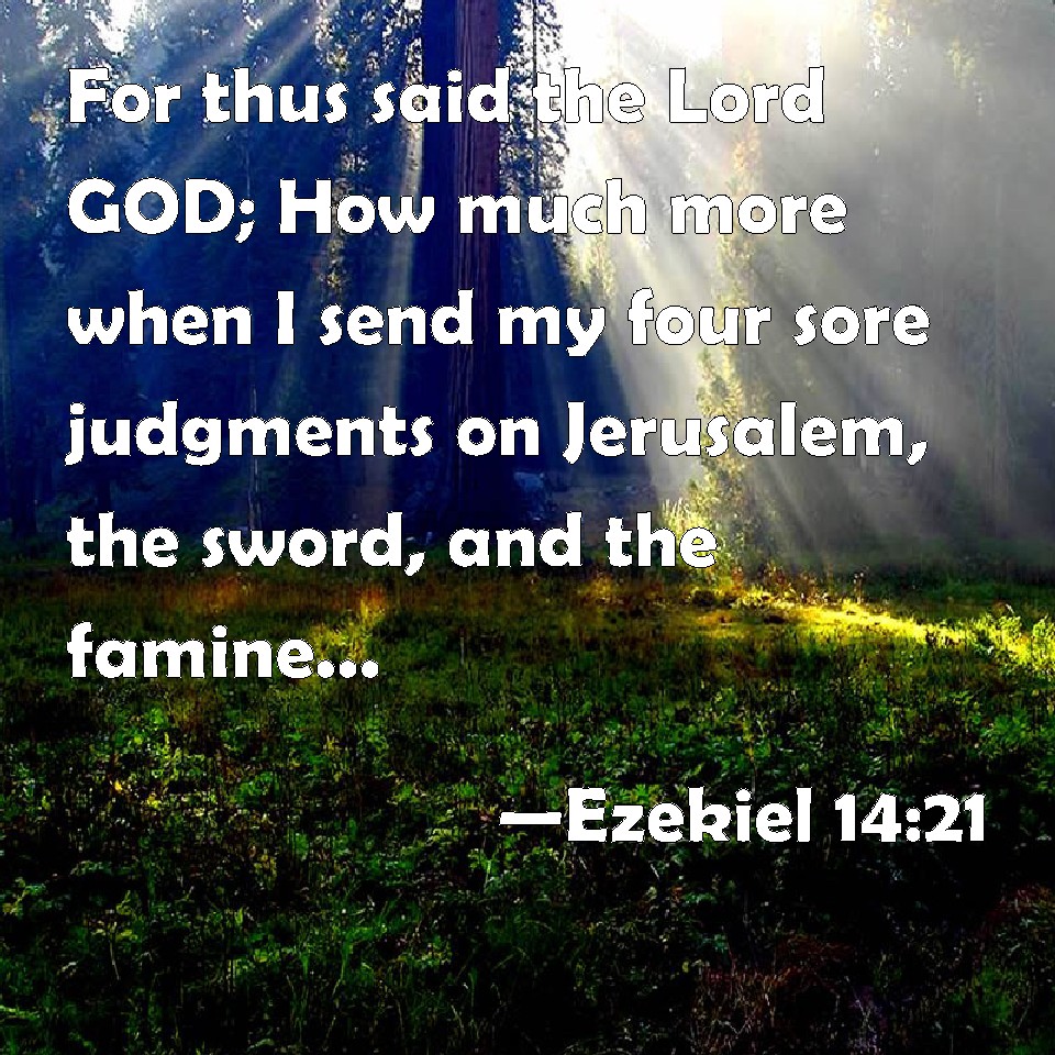 Choose a Background Ezekiel 14:21 For thus said the Lord GOD; How much more when I send my four sore judgments on Jerusalem, the sword, and the famine, and the noisome beast, and the pestilence, to cut off from it man and beast? KJV: For thus saith the Lord GOD; How much more when I send my four sore judgments upon Jerusalem, the sword, and the famine, and the noisome beast, and the pestilence, to cut off from it man and beast? DRB: For thus saith the Lord: Although I shall send in upon Jerusalem my four grievous judgments, the sword, and the famine, and the mischievous beasts, and the pestilence, to destroy out of it man and beast, DBT: For thus saith the Lord Jehovah: How much more when I send my four sore judgments upon Jerusalem, the sword, and the famine, and the evil beast, and the pestilence, to cut off from it man and beast! ERV: For thus saith the Lord GOD: How much more when I send my four sore judgments upon Jerusalem, the sword, and the famine, and the noisome beasts, and the pestilence, to cut off from it man and beast? WBT: For thus saith the Lord GOD; How much more when I send my four severe judgments upon Jerusalem, the sword, and the famine, and the noisome beast, and the pestilence, to cut off from it man and beast? WEB: For thus says the Lord Yahweh: How much more when I send my four severe judgments on Jerusalem, the sword, and the famine, and the evil animals, and the pestilence, to cut off from it man and animal! YLT: For thus said the Lord Jehovah: Although My four sore judgments — sword, and famine, and wild beast, and pestilence — I have sent unto Jerusalem, to cut off from it man and beast,Links Ezekiel 14:21 NIV • Ezekiel 14:21 NLT • Ezekiel 14:21 ESV • Ezekiel 14:21 NASB • Ezekiel 14:21 KJV • Ezekiel 14:21 Interlinear • Ezekiel 14:21 Commentaries • Ezekiel 14:21 Parallel Texts • Ezekiel 14:21 Bible Apps • Ezekiel 14:21 Parallel • Bible Hub |