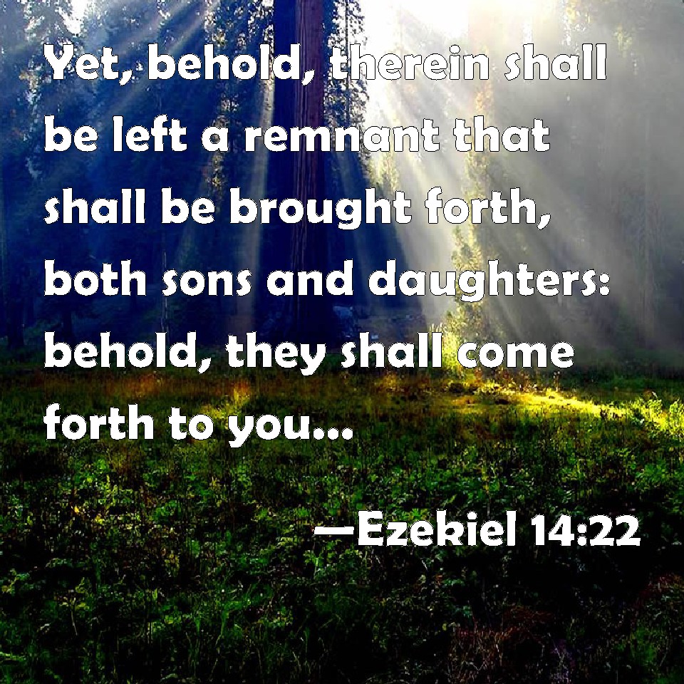 Choose a Background Ezekiel 14:22 Yet, behold, therein shall be left a remnant that shall be brought forth, both sons and daughters: behold, they shall come forth to you, and you shall see their way and their doings: and you shall be comforted concerning the evil that I have brought on Jerusalem, even concerning all that I have brought on it. KJV: Yet, behold, therein shall be left a remnant that shall be brought forth, both sons and daughters: behold, they shall come forth unto you, and ye shall see their way and their doings: and ye shall be comforted concerning the evil that I have brought upon Jerusalem, even concerning all that I have brought upon it. DRB: Yet there shall be left in it some that shall be saved, who shall bring away their sons and daughters: behold they shall come among you, and you shall see their way, and their doings: and you shall be comforted concerning the evil that I have brought upon Jerusalem, in all things that I have brought upon it. DBT: But behold, there shall be left in it those that escape, who shall be brought out of it, sons and daughters. Behold, they shall come forth unto you, and ye shall see their way and their doings; and ye shall be comforted concerning the evil that I have brought upon Jerusalem, as to all that I have brought upon it. ERV: Yet, behold, therein shall be left a remnant that shall be carried forth, both sons and daughters: behold, they shall come forth unto you, and ye shall see their way and their doings: and ye shall be comforted concerning the evil that I have brought upon Jerusalem, even concerning all that I have brought upon it. WBT: Yet behold, therein shall be left a remnant that shall be brought forth, both sons and daughters: behold, they shall come forth to you, and ye shall see their way and their doings: and ye shall be comforted concerning the evil that I have brought upon Jerusalem, even concerning all that I have brought upon it. WEB: Yet, behold, therein shall be left a remnant that shall be carried forth, both sons and daughters: behold, they shall come forth to you, and you shall see their way and their doings; and you shall be comforted concerning the evil that I have brought on Jerusalem, even concerning all that I have brought on it. YLT: yet, lo, there hath been left in it an escape, who are brought forth, sons and daughters, lo, they are coming forth unto you, and ye have seen their way, and their doings, and have been comforted concerning the evil that I have brought in against Jerusalem, all that which I have brought in against it.Links Ezekiel 14:22 NIV • Ezekiel 14:22 NLT • Ezekiel 14:22 ESV • Ezekiel 14:22 NASB • Ezekiel 14:22 KJV • Ezekiel 14:22 Interlinear • Ezekiel 14:22 Commentaries • Ezekiel 14:22 Parallel Texts • Ezekiel 14:22 Bible Apps • Ezekiel 14:22 Parallel • Bible Hub |
