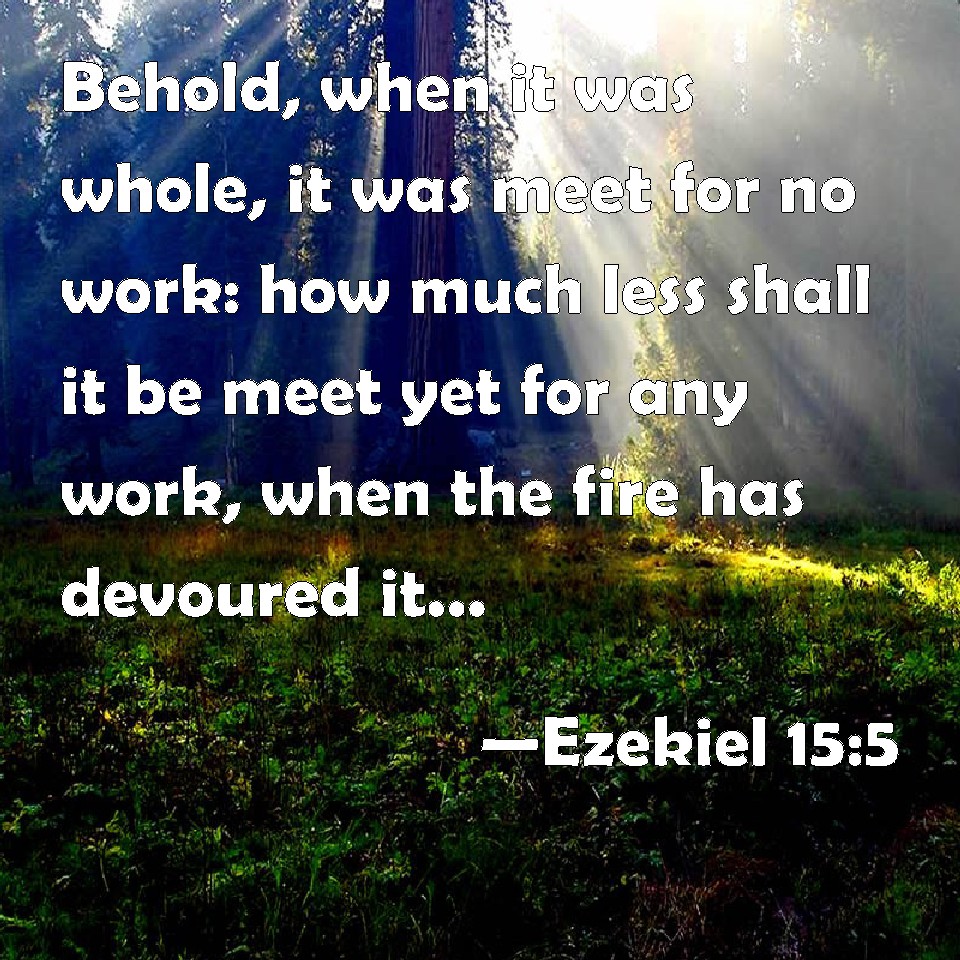 Choose a Background Ezekiel 15:5 Behold, when it was whole, it was meet for no work: how much less shall it be meet yet for any work, when the fire has devoured it, and it is burned? KJV: Behold, when it was whole, it was meet for no work: how much less shall it be meet yet for any work, when the fire hath devoured it, and it is burned? DRB: Even when it was whole it was not fit for work: how much less, when the fire hath devoured and consumed it, shall any work be made of it? DBT: Behold, when it was whole, it was used for no work; how much less when the fire hath consumed it, and it is burned, should it yet be used for any work? ERV: Behold, when it was whole, it was meet for no work: how much less, when the fire hath devoured it, and it is burned, shall it yet be meet for any work? WBT: Behold, when it was whole, it was fit for no work: how much less then shall it be fit for any work, when the fire hath devoured it, and it is burned? WEB: Behold, when it was whole, it was meet for no work: how much less, when the fire has devoured it, and it is burned, shall it yet be meet for any work! YLT: Lo, in its being perfect it is not used for work, How much less, when fire hath eaten of it, And it is scorched, Hath it been used yet for work?Links Ezekiel 15:5 NIV • Ezekiel 15:5 NLT • Ezekiel 15:5 ESV • Ezekiel 15:5 NASB • Ezekiel 15:5 KJV • Ezekiel 15:5 Interlinear • Ezekiel 15:5 Commentaries • Ezekiel 15:5 Parallel Texts • Ezekiel 15:5 Bible Apps • Ezekiel 15:5 Parallel • Bible Hub |