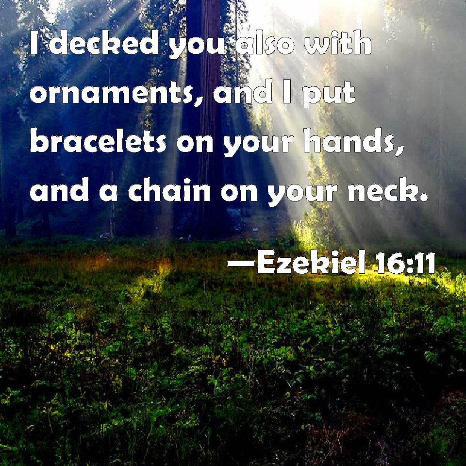 Choose a Background Ezekiel 16:11 I decked you also with ornaments, and I put bracelets on your hands, and a chain on your neck. KJV: I decked thee also with ornaments, and I put bracelets upon thy hands, and a chain on thy neck. DRB: I decked thee also with ornaments, and put bracelets on thy hands, and a chain about thy neck. DBT: And I decked thee with ornaments, and I put bracelets upon thy hands, and a chain on thy neck; ERV: I decked thee also with ornaments, and I put bracelets upon thy hands, and a chain on thy neck. WBT: I decked thee also with ornaments, and I put bracelets upon thy hands, and a chain on thy neck. WEB: I decked you with ornaments, and I put bracelets on your hands, and a chain on your neck. YLT: And I adorn thee with adornments, And I give bracelets for thy hands, And a chain for thy neck.Links Ezekiel 16:11 NIV • Ezekiel 16:11 NLT • Ezekiel 16:11 ESV • Ezekiel 16:11 NASB • Ezekiel 16:11 KJV • Ezekiel 16:11 Interlinear • Ezekiel 16:11 Commentaries • Ezekiel 16:11 Parallel Texts • Ezekiel 16:11 Bible Apps • Ezekiel 16:11 Parallel • Bible Hub |