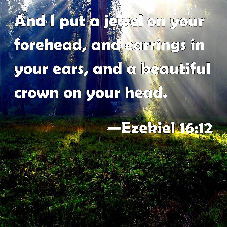 Choose a Background Ezekiel 16:12 And I put a jewel on your forehead, and earrings in your ears, and a beautiful crown on your head. KJV: And I put a jewel on thy forehead, and earrings in thine ears, and a beautiful crown upon thine head. DRB: And I put a jewel upon thy forehead and earrings in thy ears, and a beautiful crown upon thy head. DBT: and I put a ring on thy nose, and earrings in thine ears, and a beautiful crown upon thy head. ERV: And I put a ring upon thy nose, and earrings in thine ears, and a beautiful crown upon thine head. WBT: And I put a jewel on thy forehead, and ear-rings in thy ears, and a beautiful crown upon thy head. WEB: I put a ring on your nose, and earrings in your ears, and a beautiful crown on your head. YLT: And I give a ring for thy nose, And rings for thine ears, And a crown of beauty on thy head.Links Ezekiel 16:12 NIV • Ezekiel 16:12 NLT • Ezekiel 16:12 ESV • Ezekiel 16:12 NASB • Ezekiel 16:12 KJV • Ezekiel 16:12 Interlinear • Ezekiel 16:12 Commentaries • Ezekiel 16:12 Parallel Texts • Ezekiel 16:12 Bible Apps • Ezekiel 16:12 Parallel • Bible Hub |