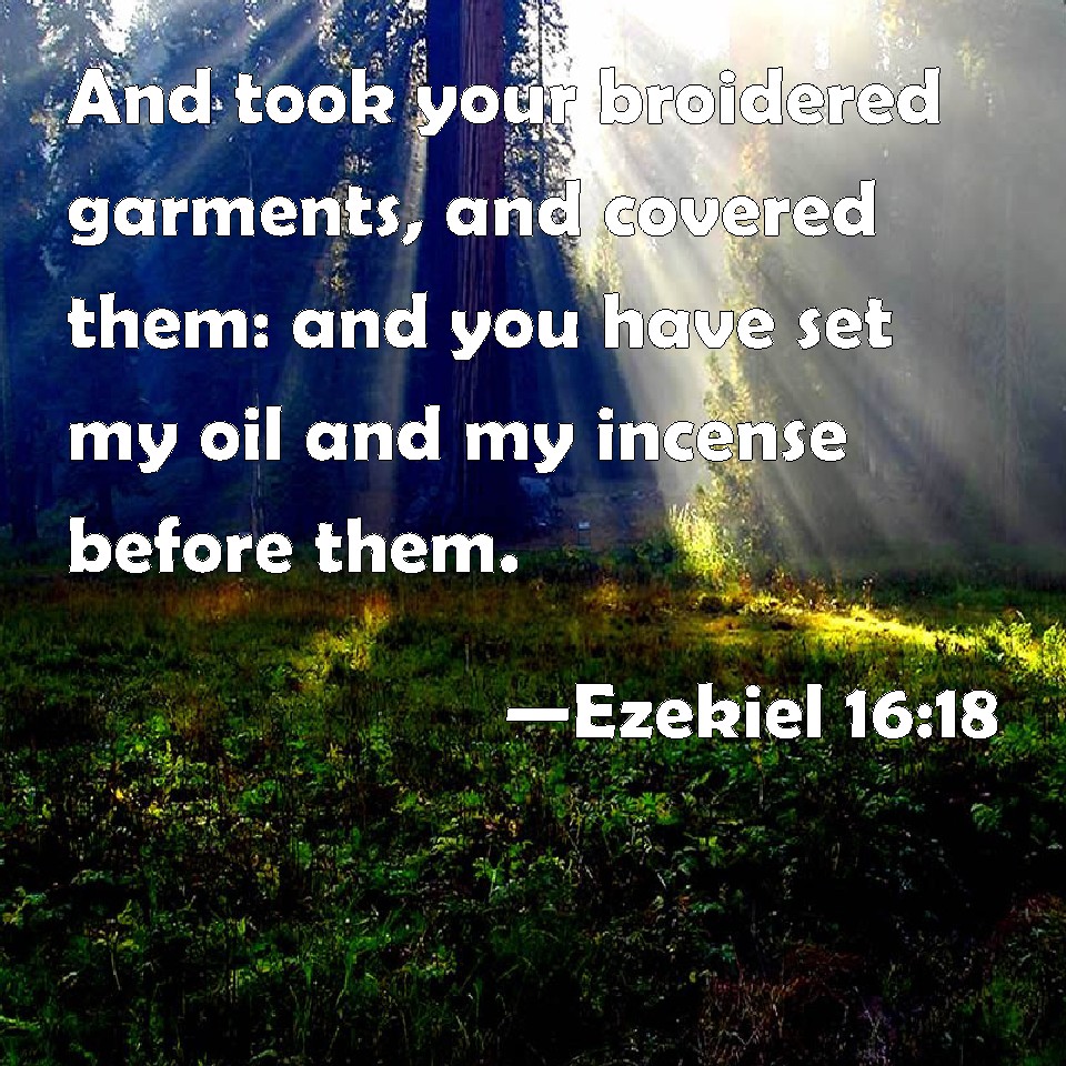 Choose a Background Ezekiel 16:18 And took your broidered garments, and covered them: and you have set my oil and my incense before them. KJV: And tookest thy broidered garments, and coveredst them: and thou hast set mine oil and mine incense before them. DRB: And thou tookest thy garments of divers colours, and coveredst them : and settest my oil and my sweet incense before them. DBT: And thou tookest thine embroidered garments, and coveredst them; and thou didst set mine oil and mine incense before them. ERV: and thou tookest thy broidered garments, and coveredst them, and didst set mine oil and mine incense before them. WBT: And hast taken thy broidered garments, and covered them: and thou hast set my oil and my incense before them. WEB: and you took your embroidered garments, and covered them, and did set my oil and my incense before them. YLT: And dost take the garments of thy embroidery, And thou dost cover them, And My oil and My perfume thou hast set before them.Links Ezekiel 16:18 NIV • Ezekiel 16:18 NLT • Ezekiel 16:18 ESV • Ezekiel 16:18 NASB • Ezekiel 16:18 KJV • Ezekiel 16:18 Interlinear • Ezekiel 16:18 Commentaries • Ezekiel 16:18 Parallel Texts • Ezekiel 16:18 Bible Apps • Ezekiel 16:18 Parallel • Bible Hub |