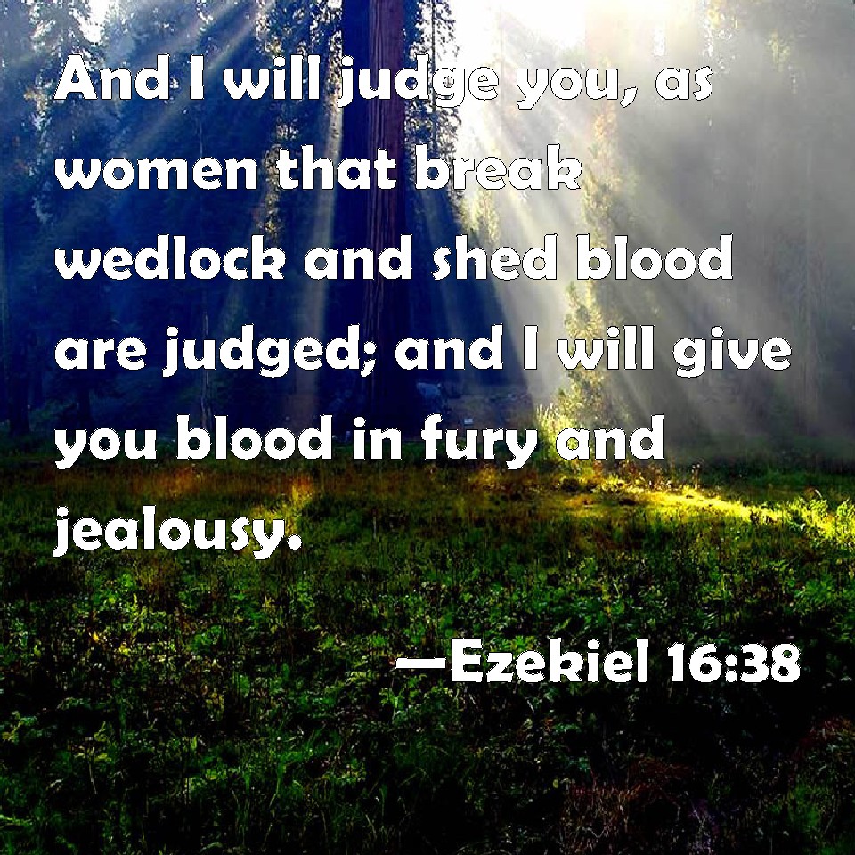 Choose a Background Ezekiel 16:38 And I will judge you, as women that break wedlock and shed blood are judged; and I will give you blood in fury and jealousy. KJV: And I will judge thee, as women that break wedlock and shed blood are judged; and I will give thee blood in fury and jealousy. DRB: And I will judge thee as adulteresses, and they that shed blood are judged: and I will give thee blood in fury and jealousy. DBT: And I will judge thee with the judgments of women that commit adultery and shed blood; and I will give thee up to the blood of fury and jealousy; ERV: And I will judge thee, as women that break wedlock and shed blood are judged; and I will bring upon thee the blood of fury and jealousy. WBT: And I will judge thee, as women that break wedlock and shed blood are judged; and I will give thee blood in fury and jealousy. WEB: I will judge you, as women who break wedlock and shed blood are judged; and I will bring on you the blood of wrath and jealousy. YLT: And I have judged thee — judgments of adulteresses, And of women shedding blood, And have given thee blood, fury, and jealousy.Links Ezekiel 16:38 NIV • Ezekiel 16:38 NLT • Ezekiel 16:38 ESV • Ezekiel 16:38 NASB • Ezekiel 16:38 KJV • Ezekiel 16:38 Interlinear • Ezekiel 16:38 Commentaries • Ezekiel 16:38 Parallel Texts • Ezekiel 16:38 Bible Apps • Ezekiel 16:38 Parallel • Bible Hub |