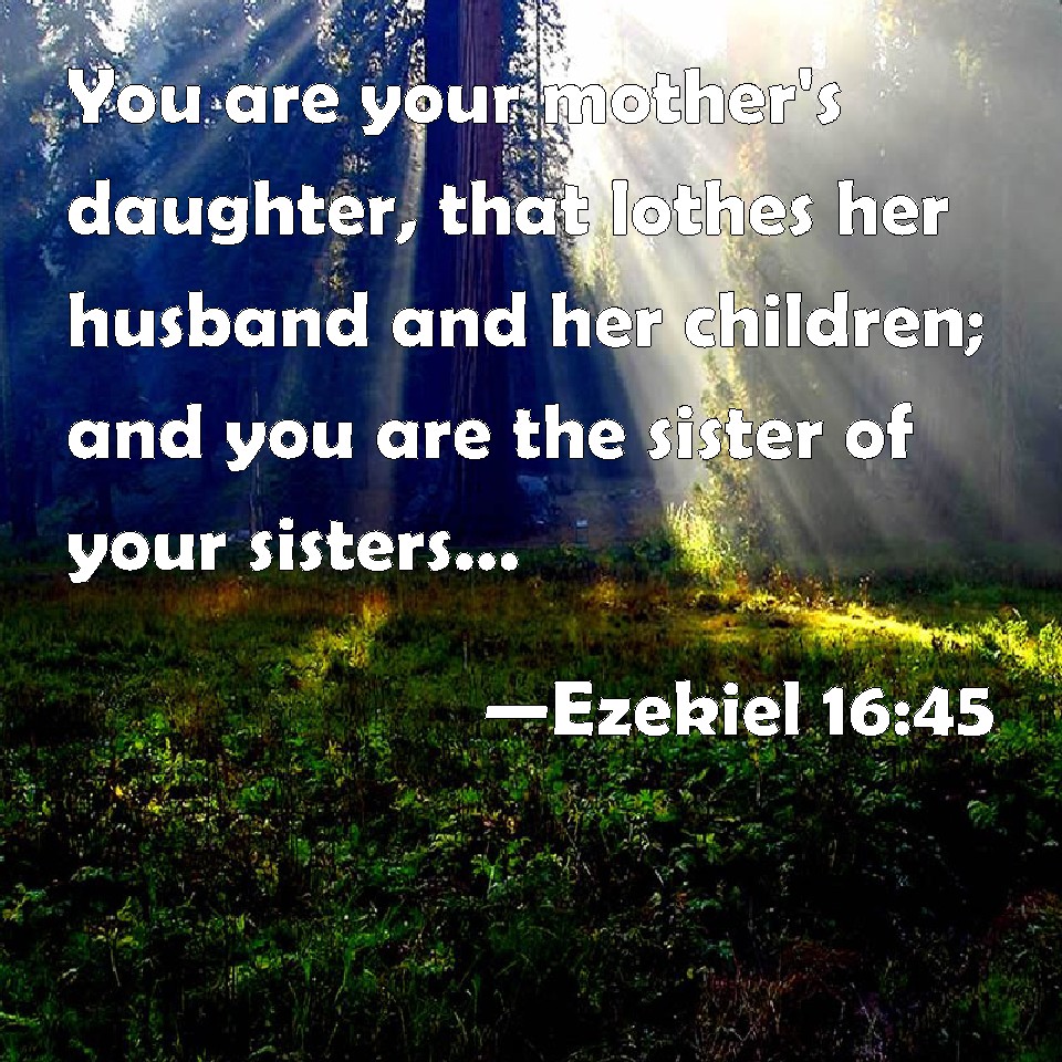 Choose a Background Ezekiel 16:45 You are your mother's daughter, that loathes her husband and her children; and you are the sister of your sisters, which loathed their husbands and their children: your mother was an Hittite, and your father an Amorite. KJV: Thou art thy mother's daughter, that lotheth her husband and her children; and thou art the sister of thy sisters, which lothed their husbands and their children: your mother was an Hittite, and your father an Amorite. DRB: Thou art thy mother's daughter, that cast off her husband, and her children: and thou art the sister of thy sisters, who cast off their husbands, and their children: your mother was a Cethite, and your father an Amorrhite. DBT: Thou art the daughter of thy mother that loathed her husband and her children; and thou art the sister of thy sisters, who loathed their husbands and their children. Your mother was a Hittite, and your father an Amorite. ERV: Thou art thy mother's daughter, that loatheth her husband and her children; and thou art the sister of thy sisters, which loathed their husbands and their children: your mother was an Hittite, and your father an Amorite. WBT: Thou art thy mother's daughter, that lotheth her husband and her children; and thou art the sister of thy sisters, who lothed their husbands and their children: your mother was a Hittite, and your father an Amorite. WEB: You are the daughter of your mother, who loathes her husband and her children; and you are the sister of your sisters, who loathed their husbands and their children: your mother was a Hittite, and your father an Amorite. YLT: Thy mother's daughter thou art, Loathing her husband and her sons, And thy sisters' sister thou art, Who loathed their husbands and their sons, Your mother is a Hittite, and your father an Amorite.Links Ezekiel 16:45 NIV • Ezekiel 16:45 NLT • Ezekiel 16:45 ESV • Ezekiel 16:45 NASB • Ezekiel 16:45 KJV • Ezekiel 16:45 Interlinear • Ezekiel 16:45 Commentaries • Ezekiel 16:45 Parallel Texts • Ezekiel 16:45 Bible Apps • Ezekiel 16:45 Parallel • Bible Hub |