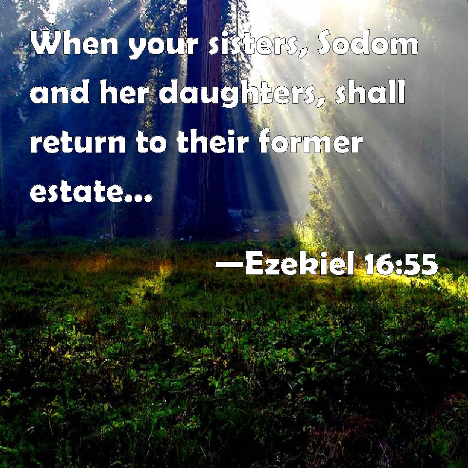 Choose a Background Ezekiel 16:55 When your sisters, Sodom and her daughters, shall return to their former estate, and Samaria and her daughters shall return to their former estate, then you and your daughters shall return to your former estate. KJV: When thy sisters, Sodom and her daughters, shall return to their former estate, and Samaria and her daughters shall return to their former estate, then thou and thy daughters shall return to your former estate. DRB: And thy sister Sodom and her daughters shall return to their ancient state: and Samaria and her daughters shall return to their ancient state: and thou and thy daughters shall return to your ancient state. DBT: And thy sisters, Sodom and her daughters, shall return to their former estate, and Samaria and her daughters shall return to their former estate; thou also and thy daughters, ye shall return to your former estate. ERV: And thy sisters, Sodom and her daughters, shall return to their former estate, and Samaria and her daughters shall return to their former estate, and thou and thy daughters shall return to your former estate. WBT: When thy sisters, Sodom and her daughters, shall return to their former state, and Samaria and her daughters shall return to their former state, then thou and thy daughters shall return to your former state. WEB: Your sisters, Sodom and her daughters, shall return to their former estate; and Samaria and her daughters shall return to their former estate; and you and your daughters shall return to your former estate. YLT: And thy sisters, Sodom and her daughters, Do turn back to their former state, And Samaria and her daughters Do turn back to their former state, And thou and thy daughters do turn back to your former state.Links Ezekiel 16:55 NIV • Ezekiel 16:55 NLT • Ezekiel 16:55 ESV • Ezekiel 16:55 NASB • Ezekiel 16:55 KJV • Ezekiel 16:55 Interlinear • Ezekiel 16:55 Commentaries • Ezekiel 16:55 Parallel Texts • Ezekiel 16:55 Bible Apps • Ezekiel 16:55 Parallel • Bible Hub |