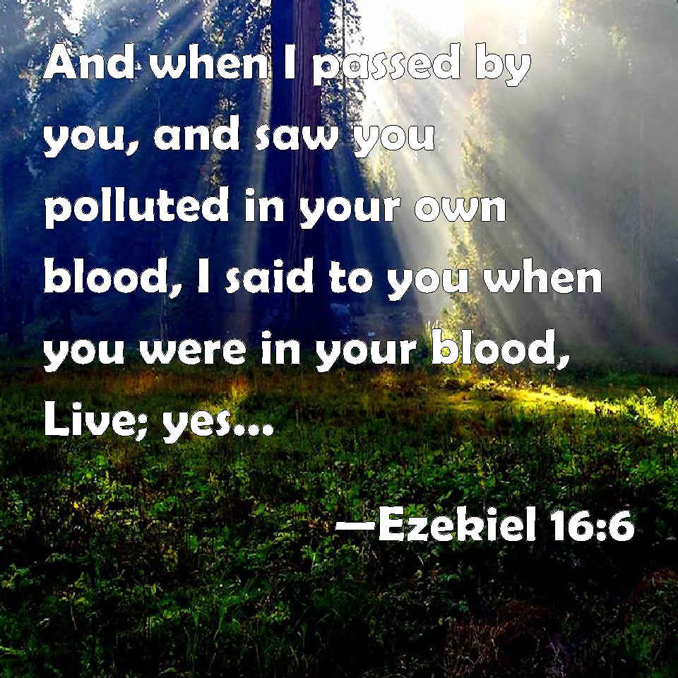 Choose a Background Ezekiel 16:6 And when I passed by you, and saw you polluted in your own blood, I said to you when you were in your blood, Live; yes, I said to you when you were in your blood, Live. KJV: And when I passed by thee, and saw thee polluted in thine own blood, I said unto thee when thou wast in thy blood, Live; yea, I said unto thee when thou wast in thy blood, Live. DRB: And passing by thee, I saw that thou wast trodden under foot in thy own blood. and I said to thee when thou wast in thy blood: Live: I have said to thee: Live in thy blood. DBT: And I passed by thee, and saw thee weltering in thy blood, and I said unto thee, in thy blood, Live! yea, I said unto thee, in thy blood, Live! ERV: And when I passed by thee, and saw thee weltering in thy blood, I said unto thee, Though thou art in thy blood, live; yea, I said unto thee, Though thou art in thy blood, live. WBT: And when I passed by thee, and saw thee polluted in thy own blood, I said to thee when thou wast in thy blood, Live; yes, I said to thee when thou wast in thy blood, Live. WEB: When I passed by you, and saw you wallowing in your blood, I said to you, [Though you are] in your blood, live; yes, I said to you, [Though you are] in your blood, live. YLT: And I do pass over by thee, And I see thee trodden down in thy blood, And I say to thee in thy blood, Live, And I say to thee in thy blood, Live.Links Ezekiel 16:6 NIV • Ezekiel 16:6 NLT • Ezekiel 16:6 ESV • Ezekiel 16:6 NASB • Ezekiel 16:6 KJV • Ezekiel 16:6 Interlinear • Ezekiel 16:6 Commentaries • Ezekiel 16:6 Parallel Texts • Ezekiel 16:6 Bible Apps • Ezekiel 16:6 Parallel • Bible Hub |
