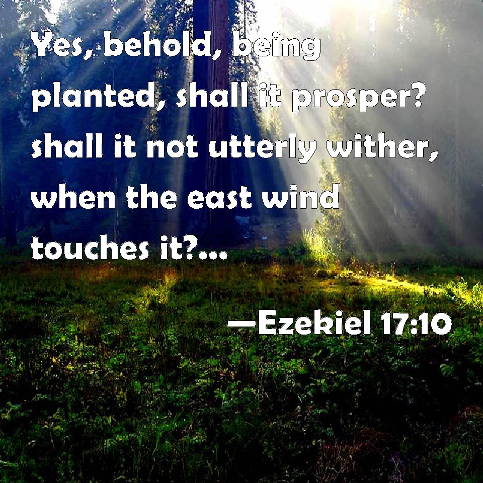 Choose a Background Ezekiel 17:10 Yes, behold, being planted, shall it prosper? shall it not utterly wither, when the east wind touches it? it shall wither in the furrows where it grew. KJV: Yea, behold, being planted, shall it prosper? shall it not utterly wither, when the east wind toucheth it? it shall wither in the furrows where it grew. DRB: Behold, it is planted: shall it prosper then? shall it not be dried up when the burning wind shall touch it, and shall it not wither in the furrows where it grew? DBT: And behold, being planted, shall it prosper? shall it not utterly wither when the east wind toucheth it? It shall wither in the beds where it grew. ERV: Yea, behold, being planted, shall it prosper? shall it not utterly wither; when the east wind toucheth it? it shall wither in the beds where it grew. WBT: Yes, behold, being planted, shall it prosper? shall it not utterly wither, when the east wind toucheth it? it shall wither in the furrows where it grew. WEB: Yes, behold, being planted, shall it prosper? shall it not utterly wither, when the east wind touches it? it shall wither in the beds where it grew. YLT: And lo, the planted thing — doth it prosper? When come against it doth the east wind, Doth it not utterly wither? On the furrows of its springing it withereth.'Links Ezekiel 17:10 NIV • Ezekiel 17:10 NLT • Ezekiel 17:10 ESV • Ezekiel 17:10 NASB • Ezekiel 17:10 KJV • Ezekiel 17:10 Interlinear • Ezekiel 17:10 Commentaries • Ezekiel 17:10 Parallel Texts • Ezekiel 17:10 Bible Apps • Ezekiel 17:10 Parallel • Bible Hub |